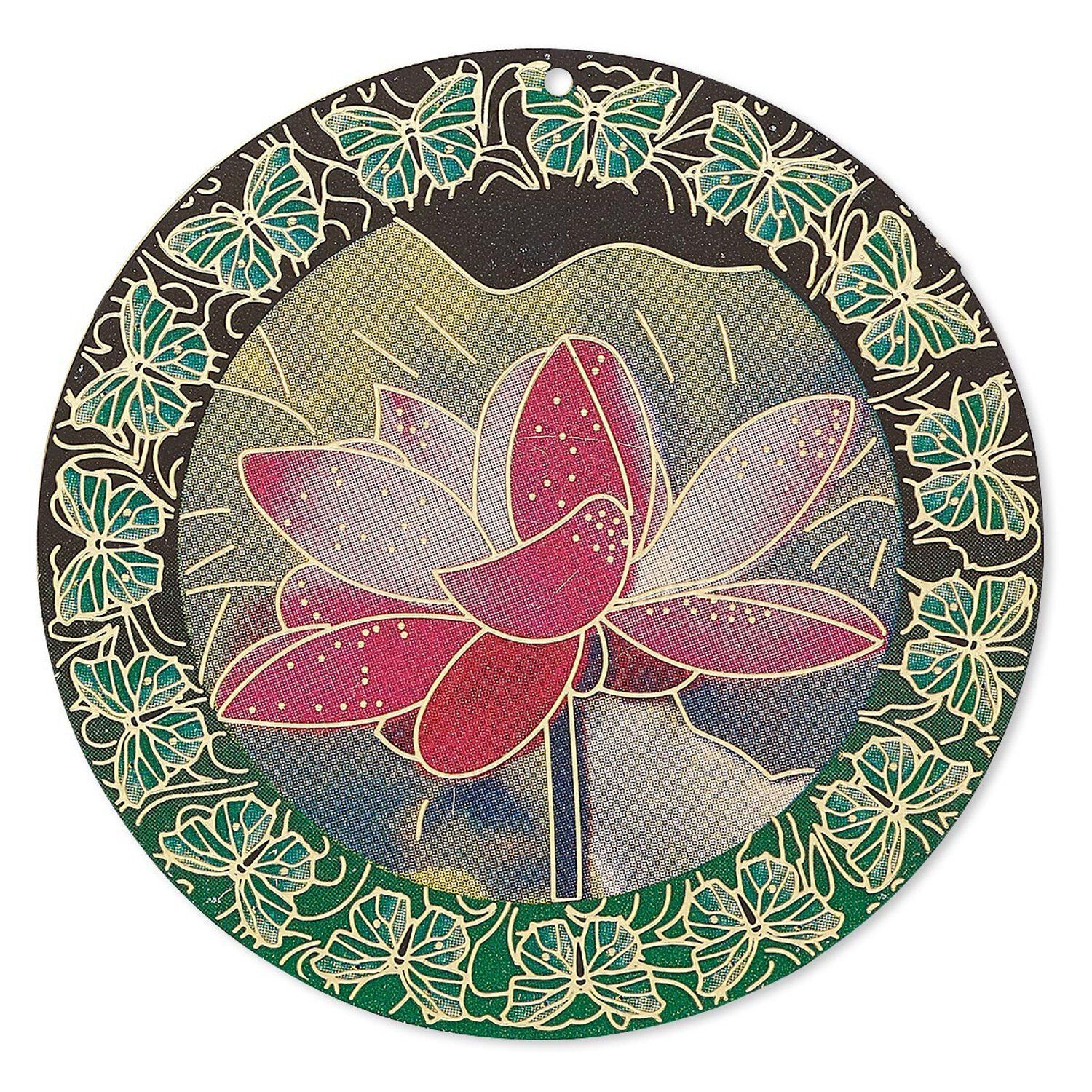 Focal, Lazer Lace™, color film and gold-finished brass, multicolored, 47mm single-sided round with lotus flower and butterfly design. Sold per pkg of 2.
