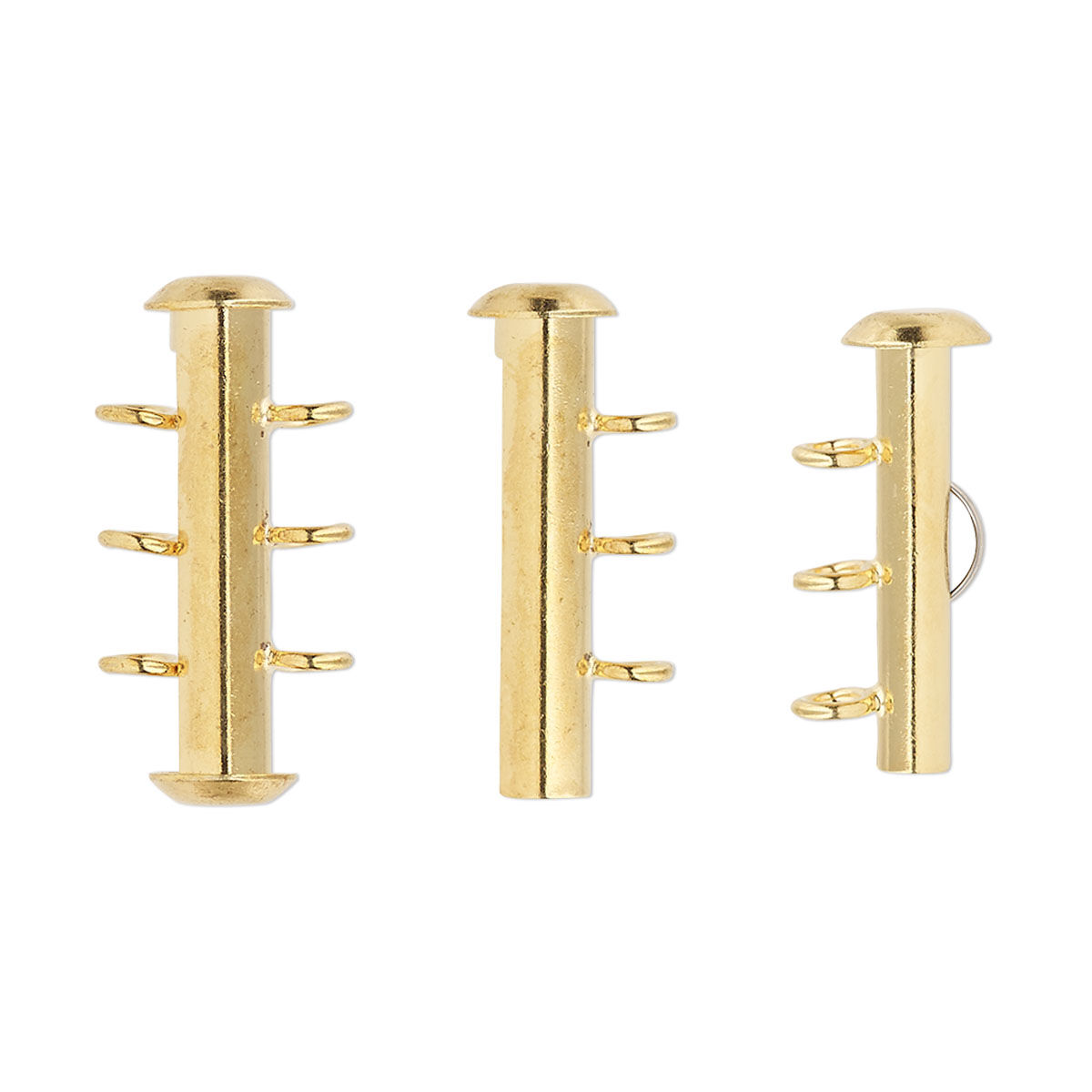 Clasp slide lock 1pkg4 gold-plated, 21x6mm round tube, brass 3-strand