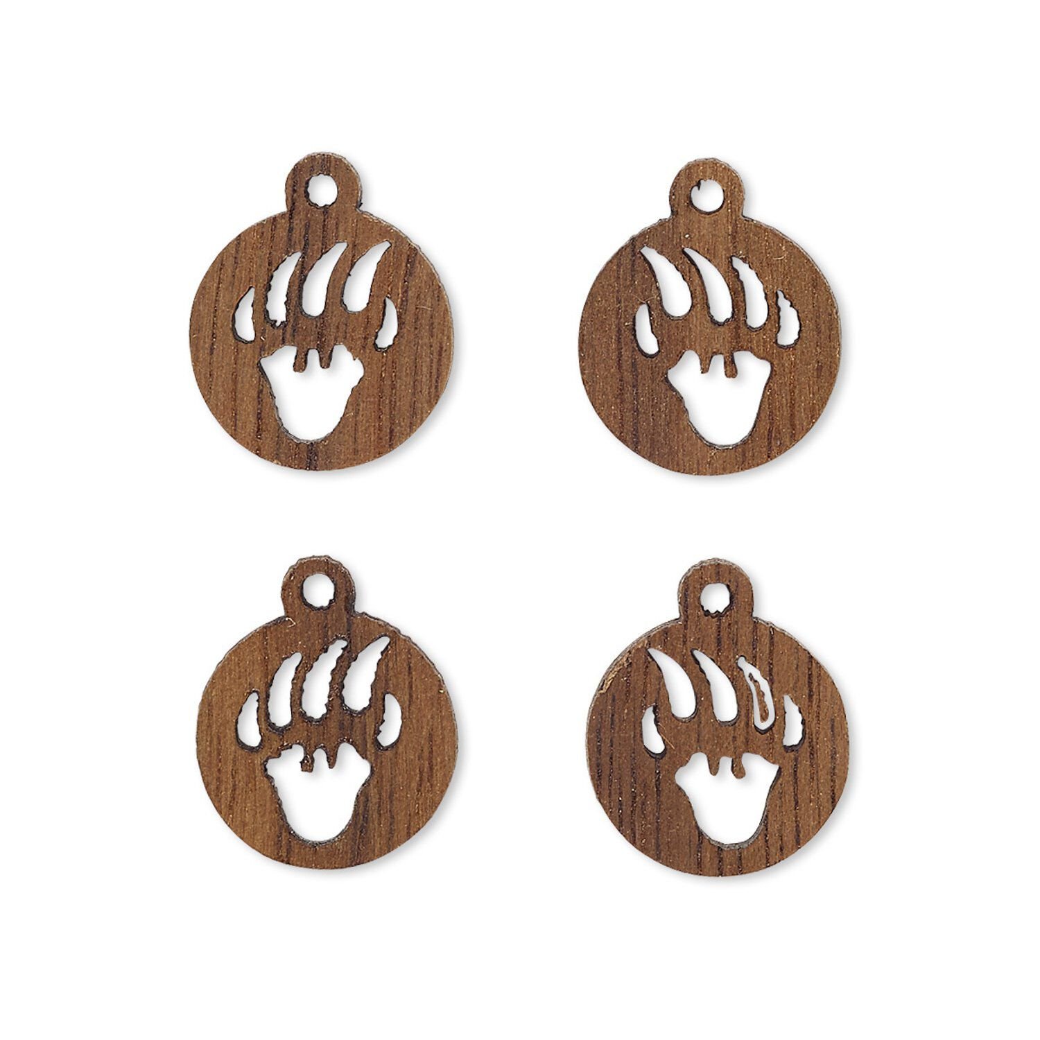 Drop, wood (natural), 11mm single-sided left- and right-facing flat round with cutout bear paw design. Sold per pkg of 4.
