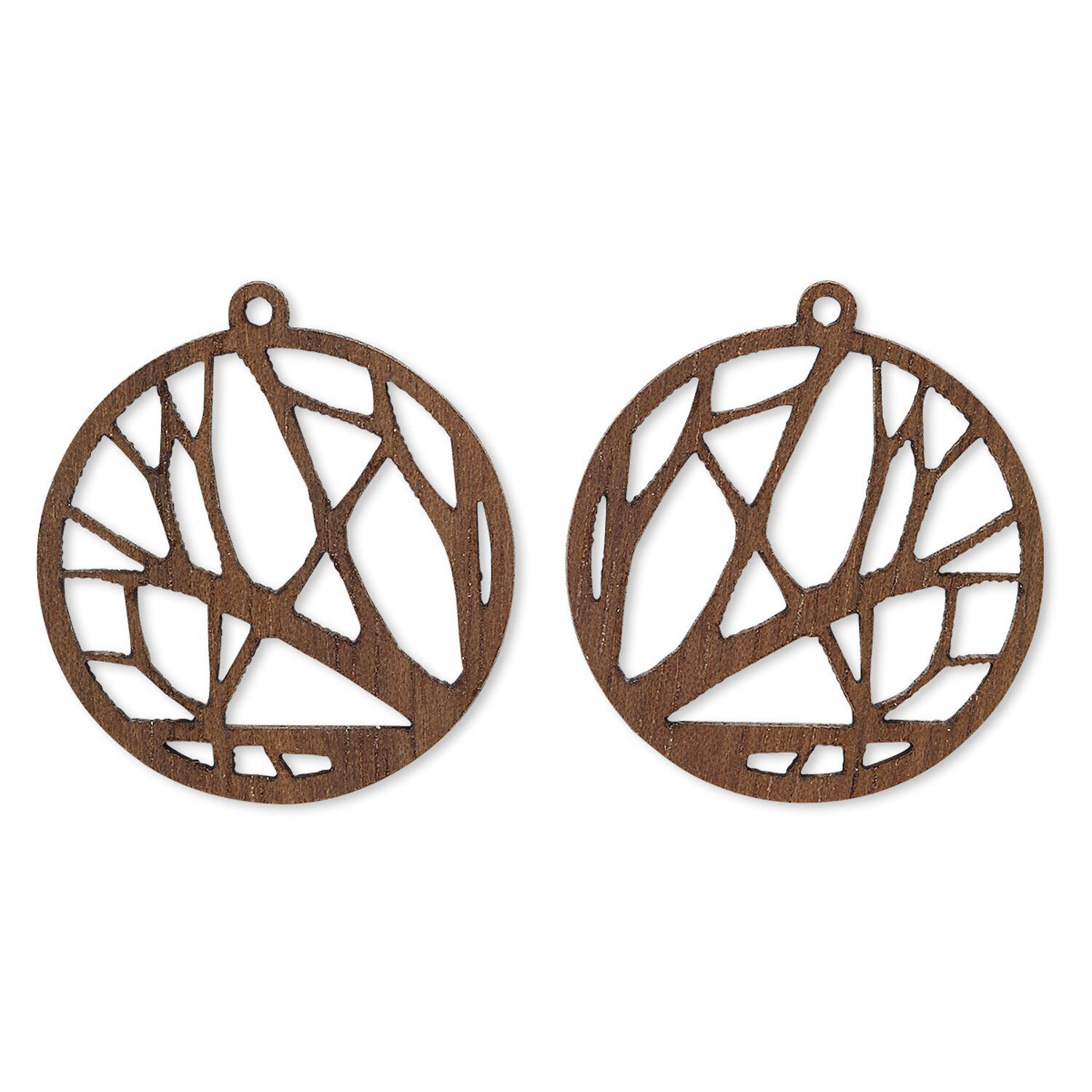 Drop, wood (natural), 25mm single-sided left- and right-facing flat round with cutout branches design. Sold per pkg of 2.