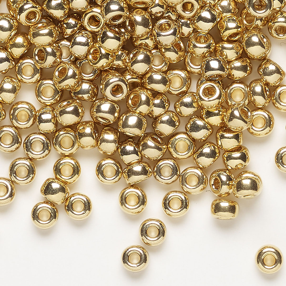 Seed bead, Miyuki, glass, pkg/4g, #6 rocaille, opaque 24Kt gold-plated light, (RR-193).
