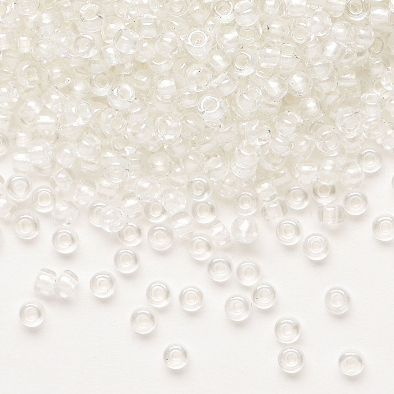 Seed bead, Miyuki, glass, pkg/50g, #8 rocaille, translucent white pearl-lined rainbow pale beige, (RR-3801).