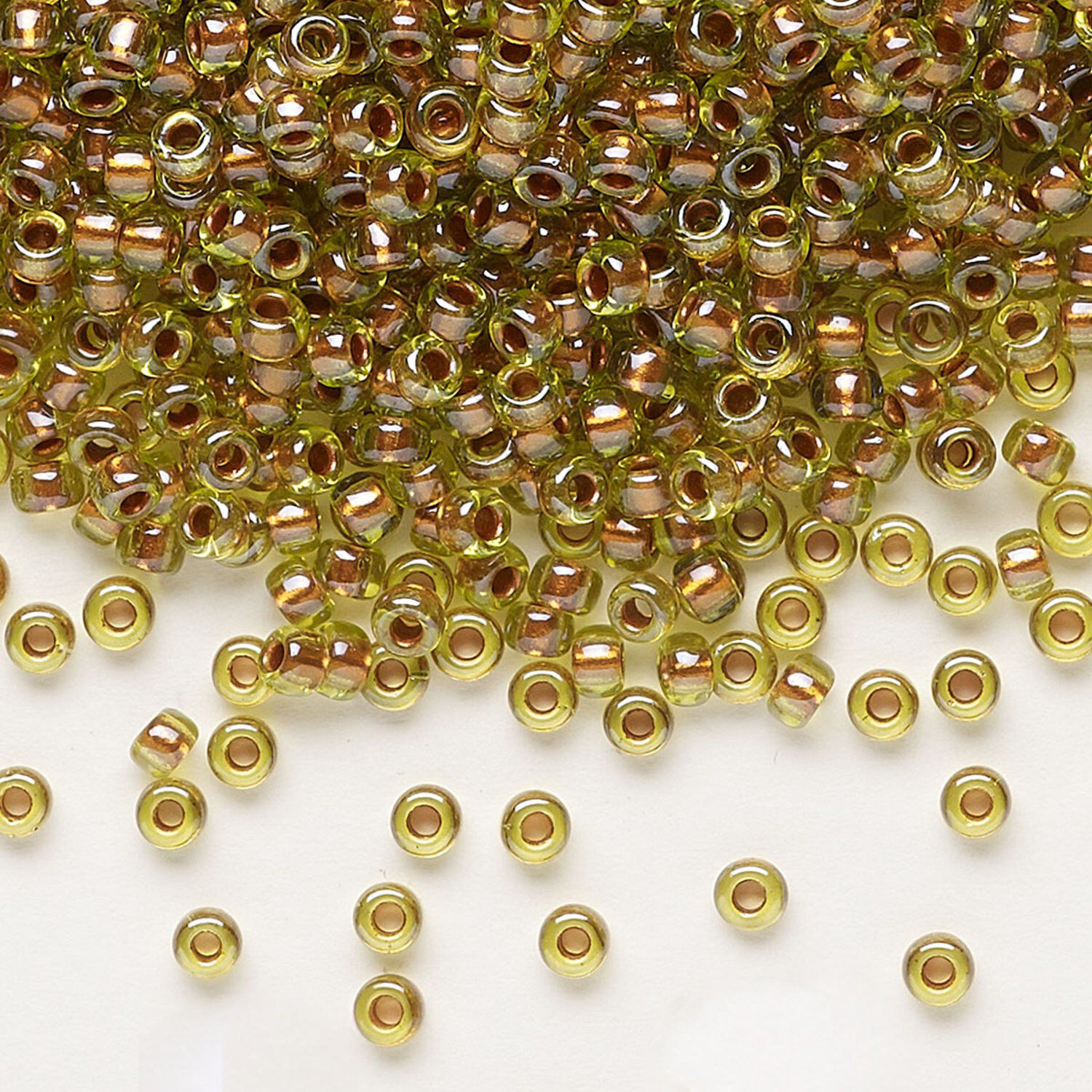 Seed bead, Miyuki, glass, pkg/50g, #8 rocaille, opaque copper pearl-lined chartreuse, (RR-3805).