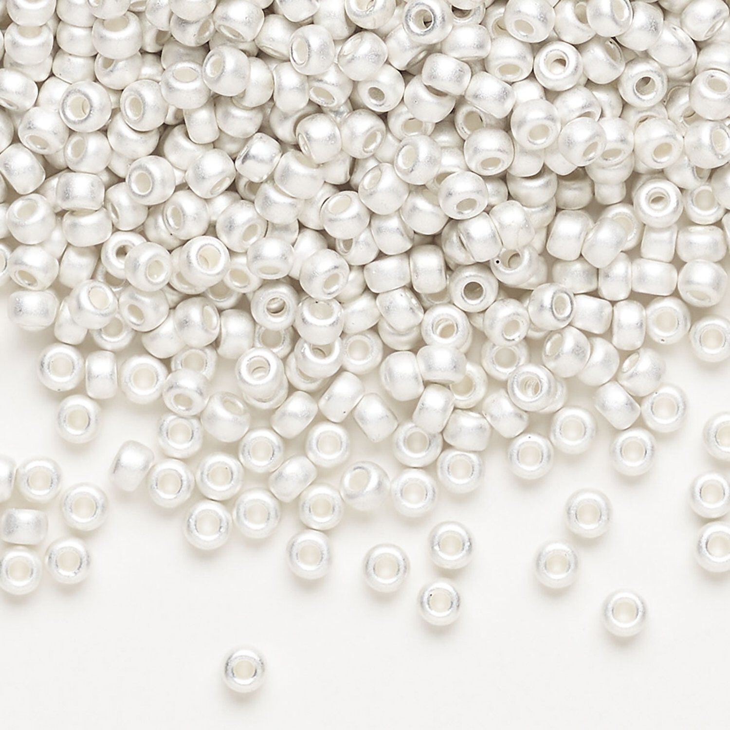 Seed bead, Miyuki, glass, pkg/4g, #8 rocaille, opaque silver-plated matte, (RR-961F).