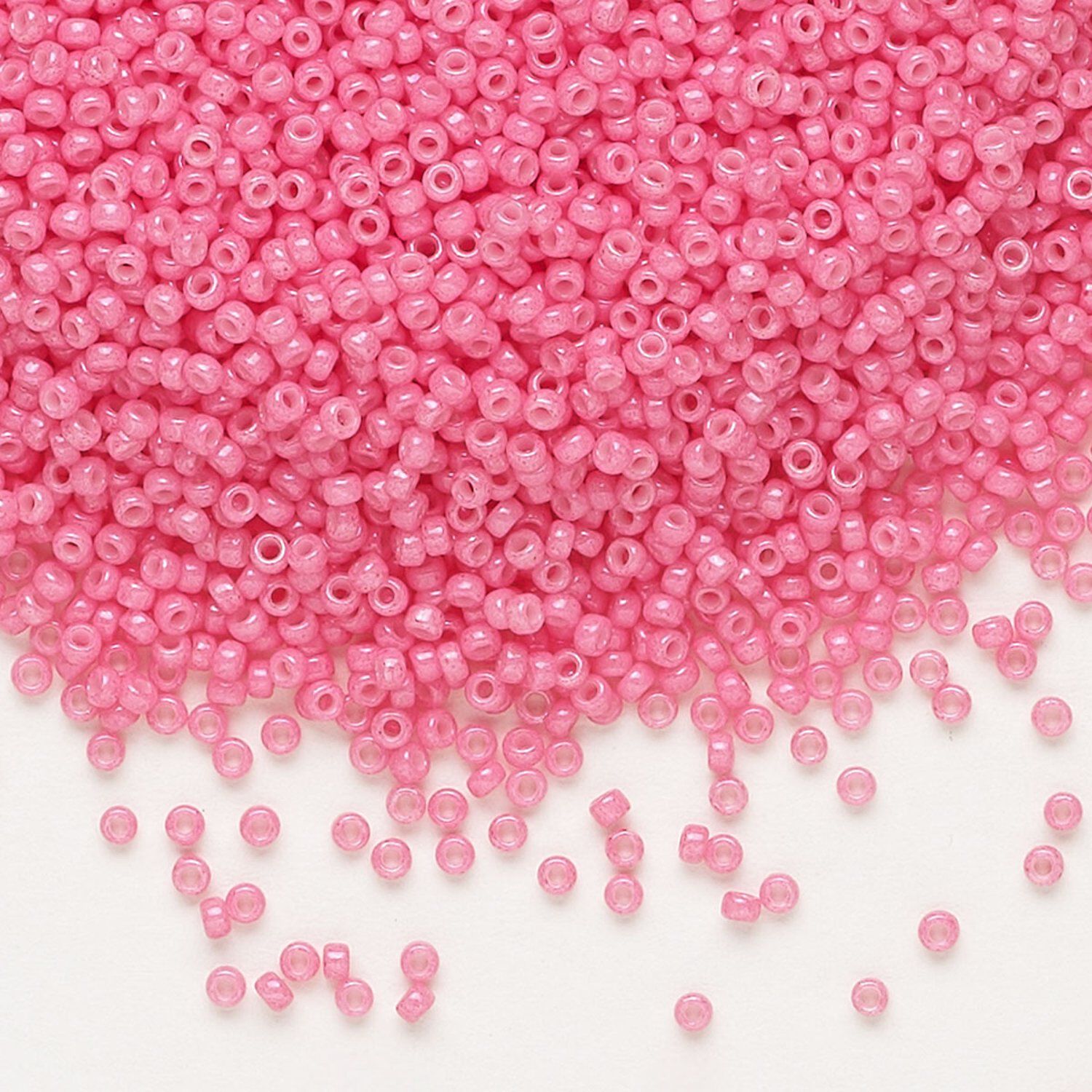 Seed bead, Miyuki, glass, pkg/35g, #15 rocaille, opaque outside dyed carnation pink, (RR-1371).