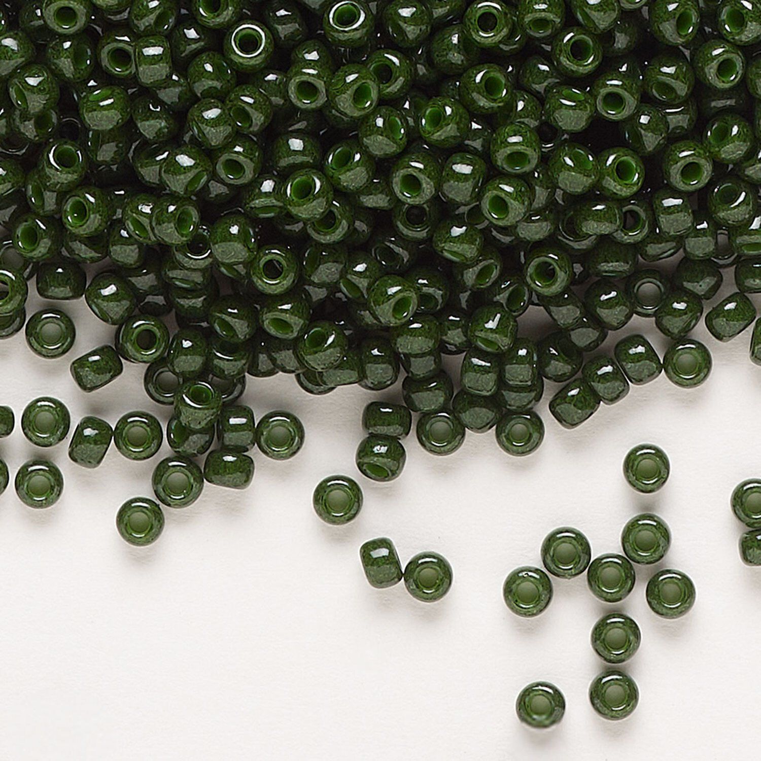 Seed bead, Miyuki, glass, pkg/50g, #8 rocaille, opaque outside dyed olive green, (RR-1488).