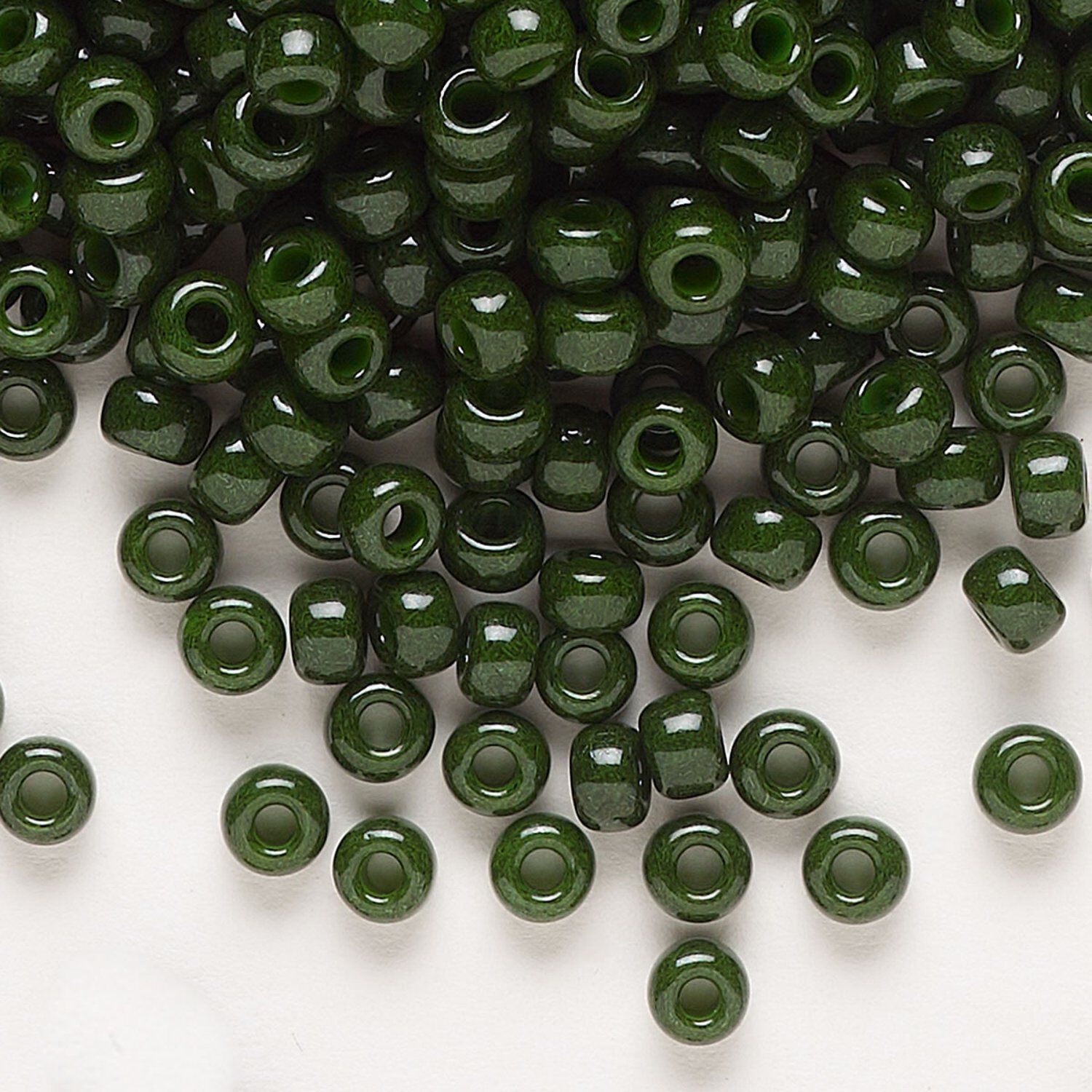 Seed bead, Miyuki, glass, pkg/25g, #6 rocaille, opaque outside dyed olive green, (RR-1488).