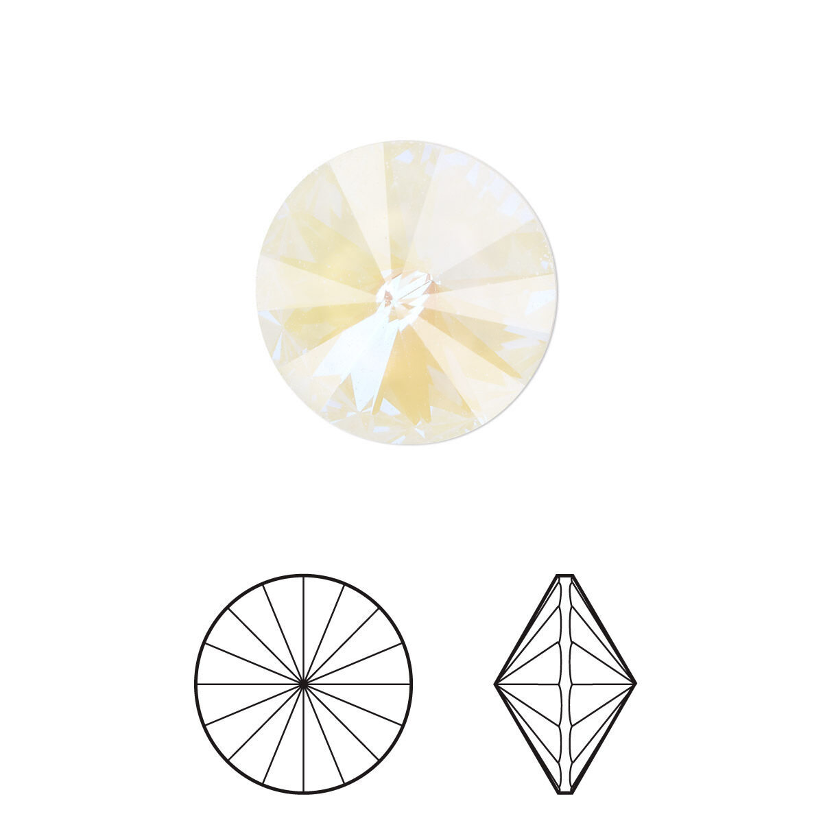 Crystal ultra white AB crystals display translucent, opalescent color, with flashes of aurora borealis color through a milky white coating. Crystal Passions® ultra AB chatons start out as crystal clear faceted rivolis (1122). A third-party vendor professionally applies a milky white coating and AB finish to one side of the precision-cut crystal—the result is a shimmering translucent component.