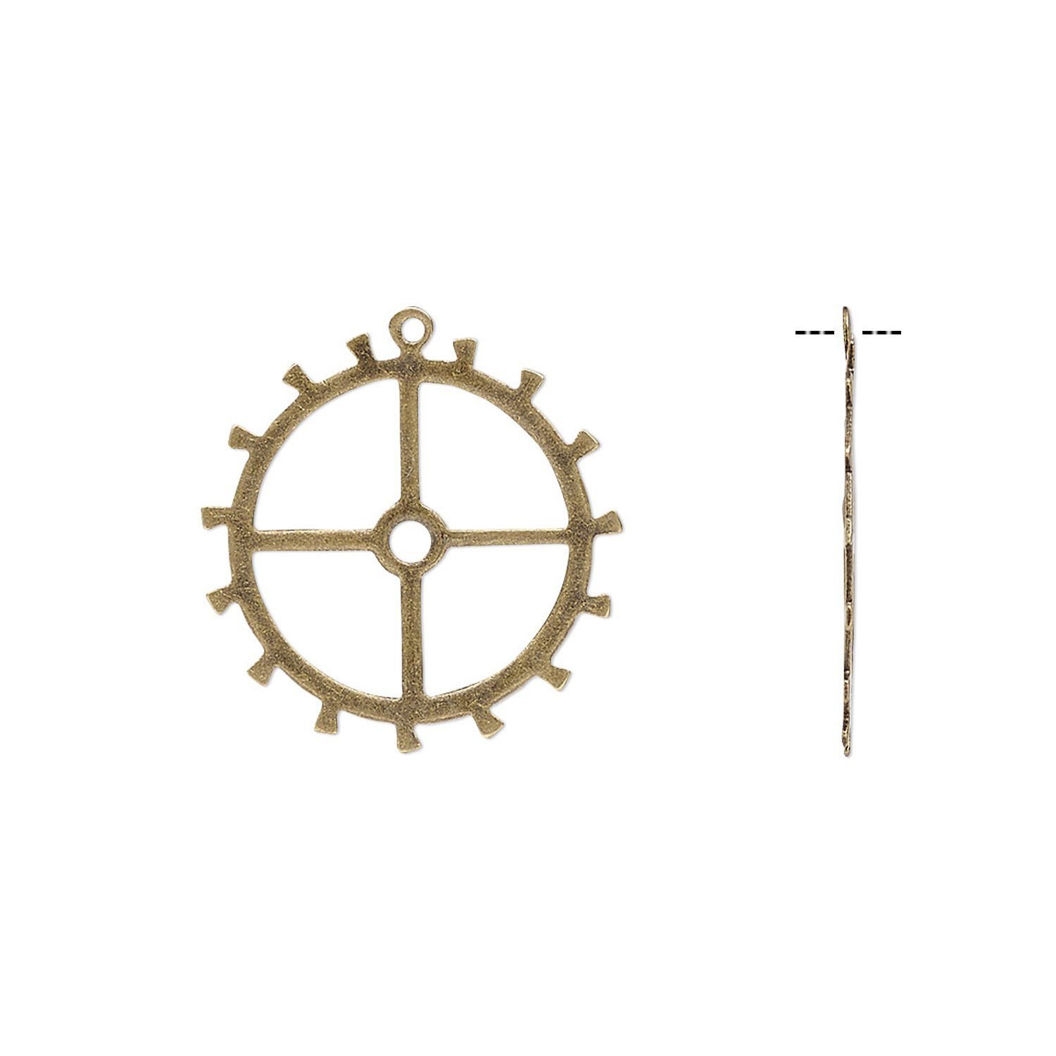 Drop, antique brass-plated brass, 19mm round gear with cutout design. Sold per pkg of 20.
