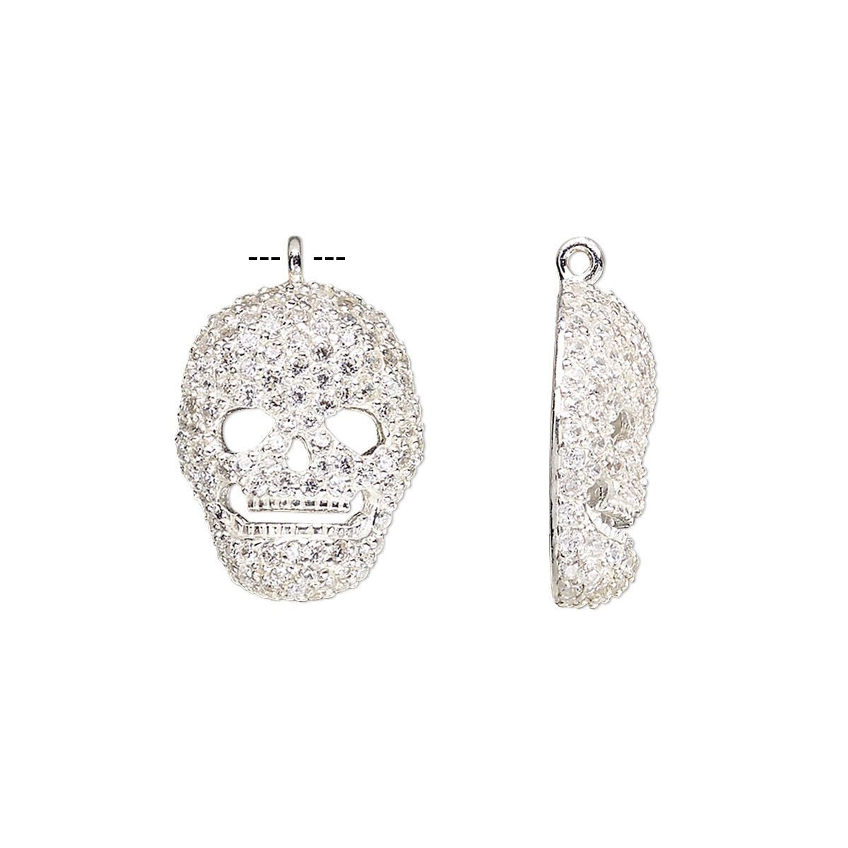 Charm, cubic zirconia and sterling silver, clear, 16x13mm skull with cutout. Sold individually.