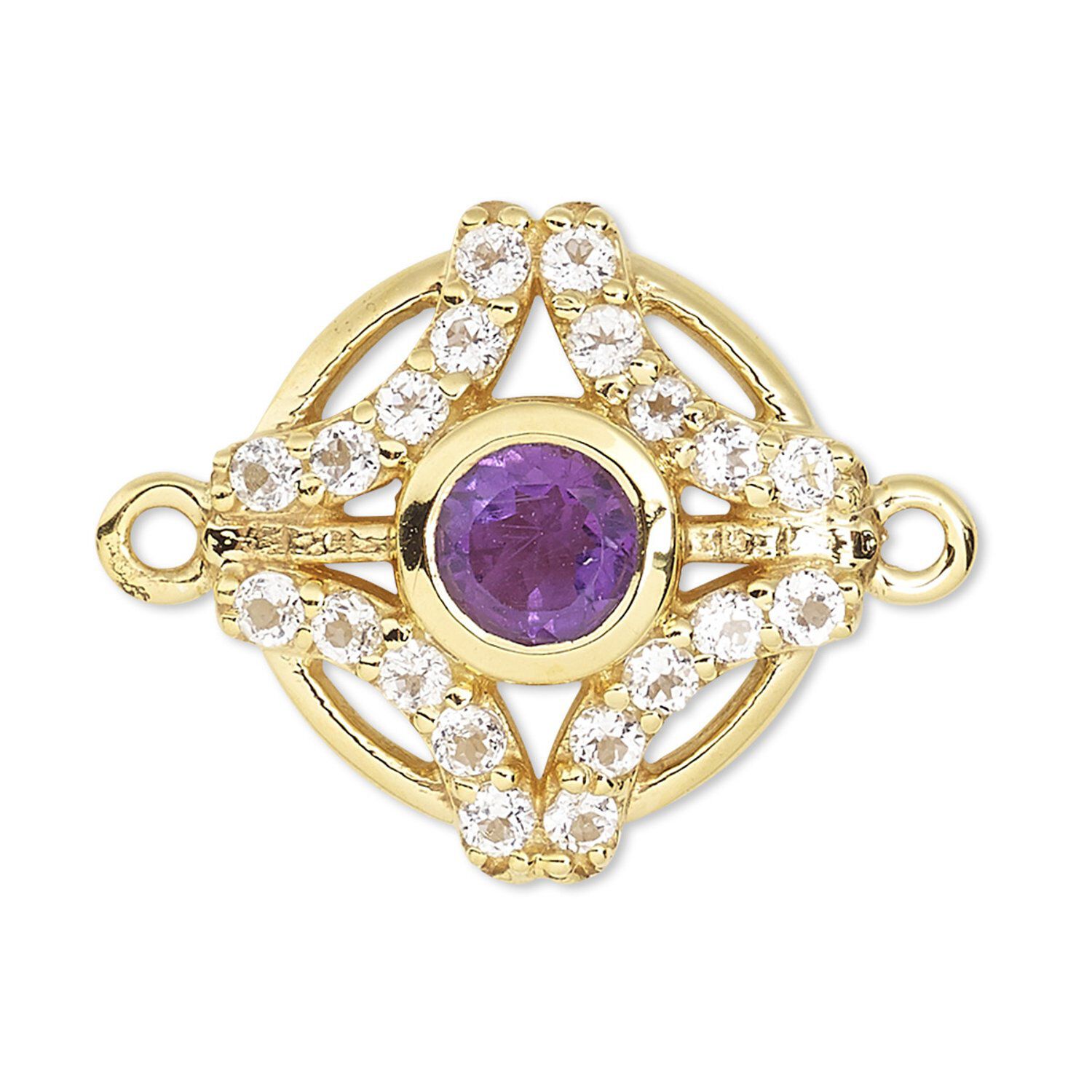 Link, amethyst / white topaz (natural) / gold-finished sterling silver, 14mm round with cutouts. Sold individually.