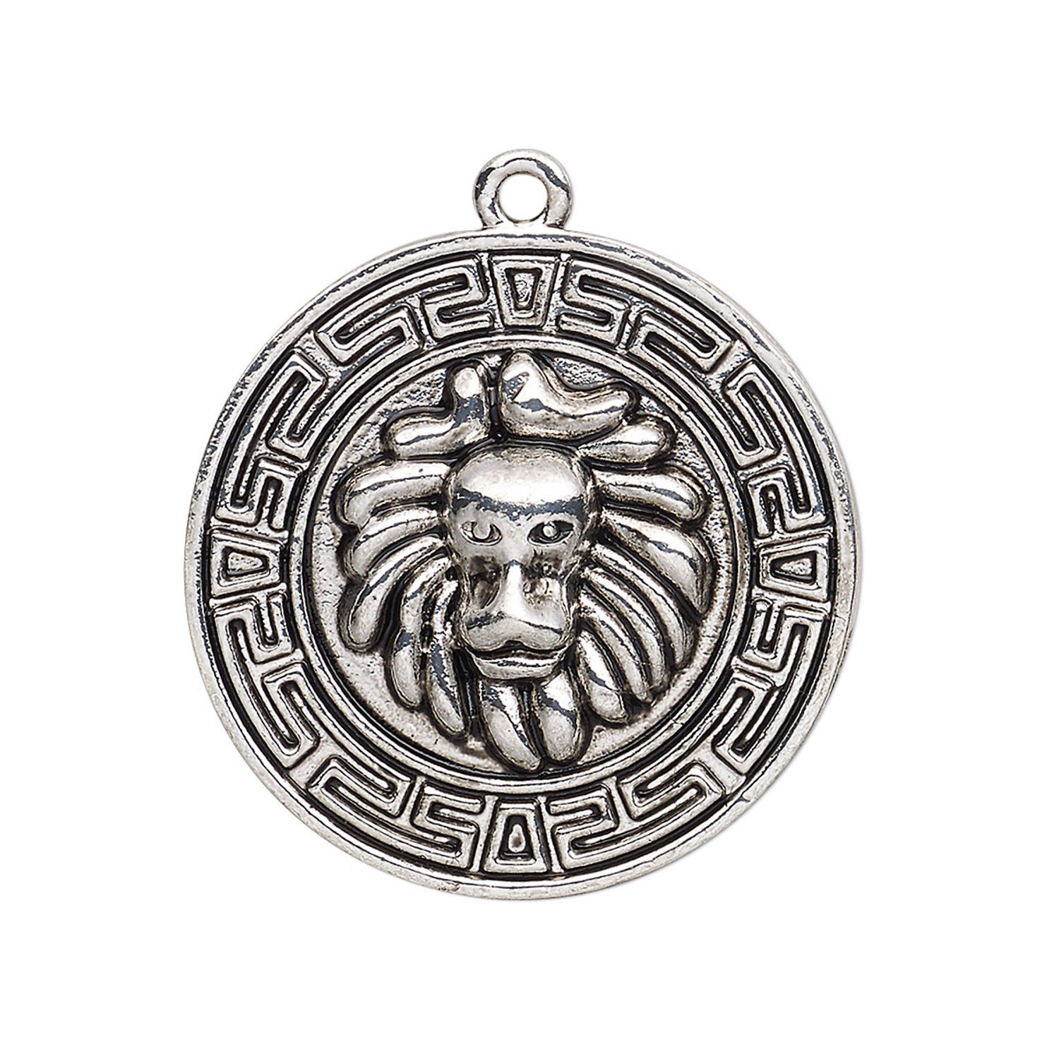 Focal, antique silver-finished "pewter" (zinc-based alloy), 30mm single-sided round with lion and geometric design. Sold per pkg of 2.