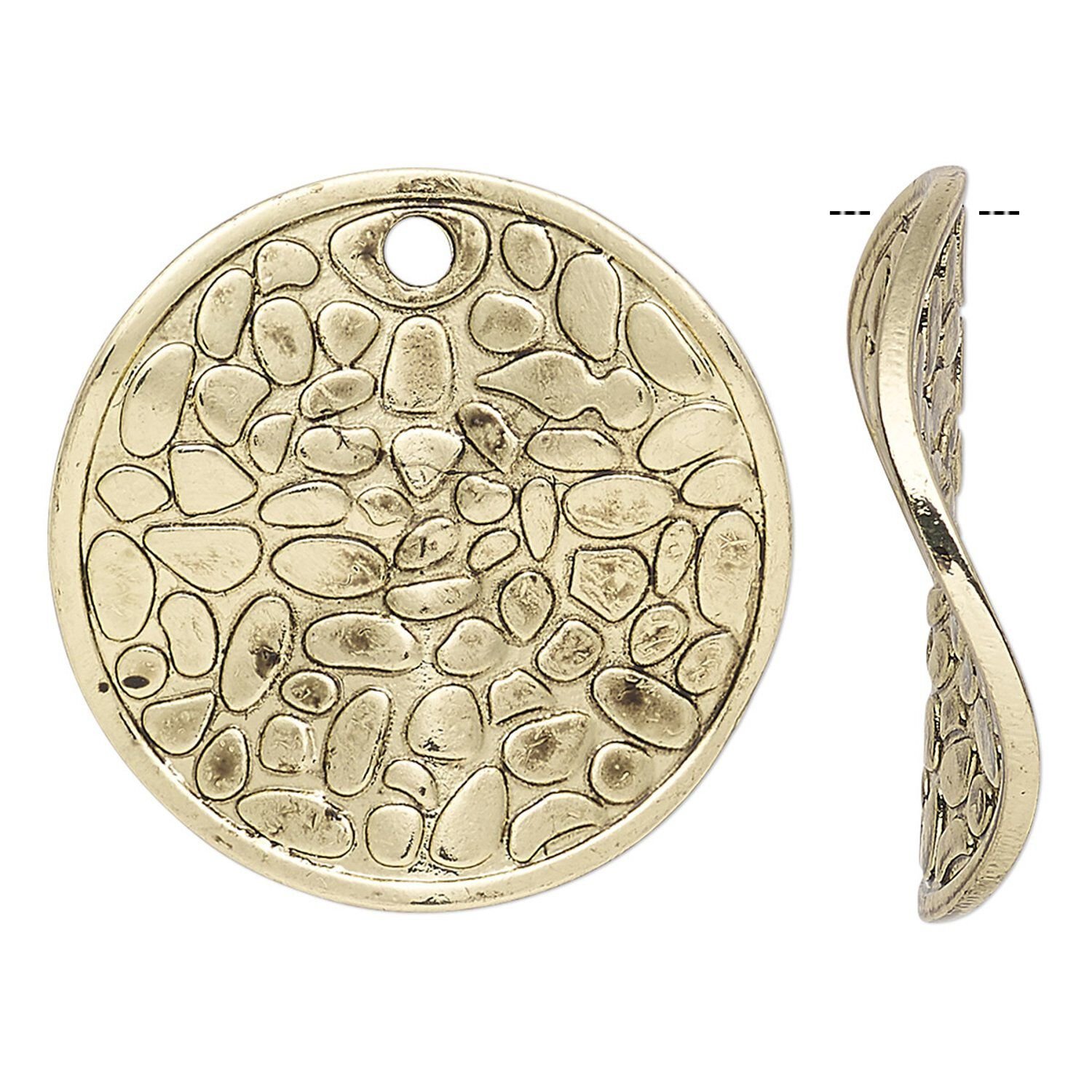 These intricately designed wavy flat rounds with a cobblestone design were inspired by talisman, or amulet, jewelry. This type of jewelry is often believed to become a token of good luck that brings joy, positive action or good memories to the wearer. These expressions, often based on sacred symbols of ancient traditions, religions or mystical concepts, are reinvented for modern trends in long-lasting "pewter" (zinc-based alloy) with an attractive antique gold finish.
