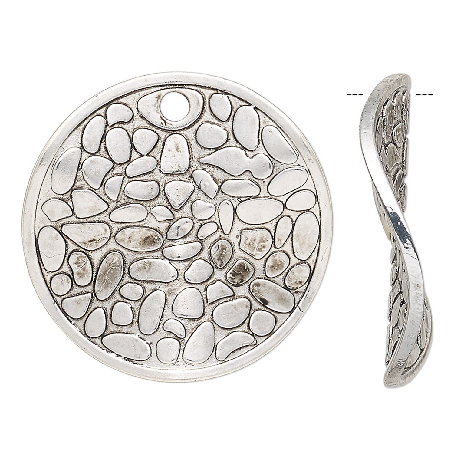 These intricately designed wavy flat rounds with a cobblestone design were inspired by talisman, or amulet, jewelry. This type of jewelry is often believed to become a token of good luck that brings joy, positive action or good memories to the wearer. These expressions, often based on sacred symbols of ancient traditions, religions or mystical concepts, are reinvented for modern trends in long-lasting "pewter" (zinc-based alloy) with an attractive antique silver finish.