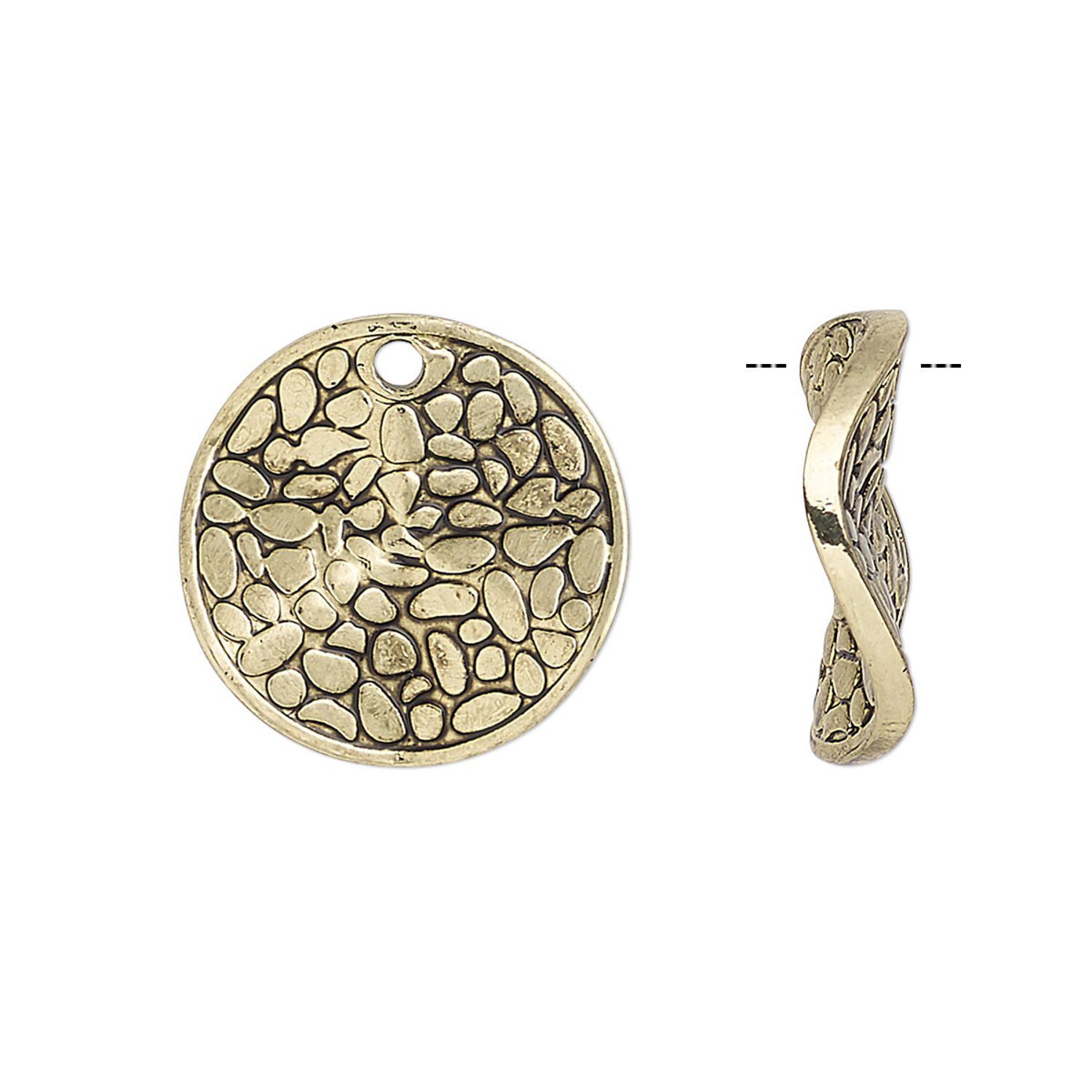 These intricately designed wavy flat rounds with a cobblestone design were inspired by talisman, or amulet, jewelry. This type of jewelry is often believed to become a token of good luck that brings joy, positive action or good memories to the wearer. These expressions, often based on sacred symbols of ancient traditions, religions or mystical concepts, are reinvented for modern trends in long-lasting "pewter" (zinc-based alloy) with an attractive antique gold finish.