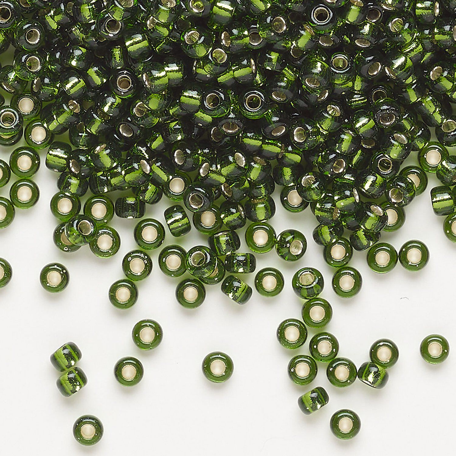 Seed bead, Miyuki, glass, pkg/50g, #8 rocaille, transparent silver-lined olive green (RR-26).