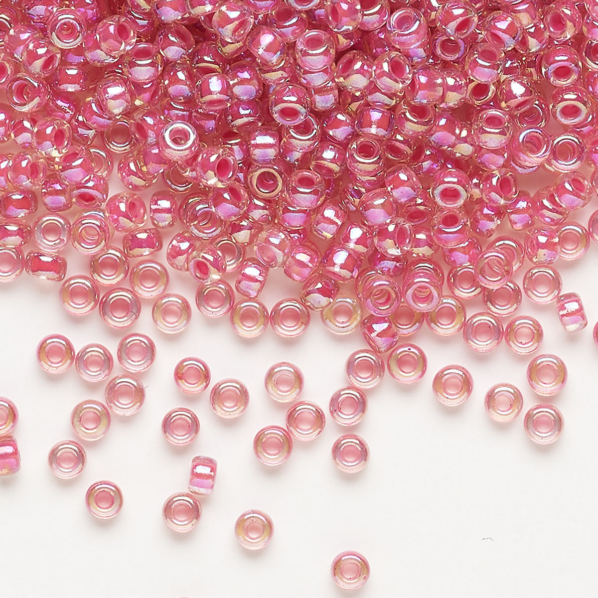 Seed bead, Miyuki, glass, pkg/50g, #8 rocaille, translucent hot pink-lined rainbow crystal clear (RR-355).