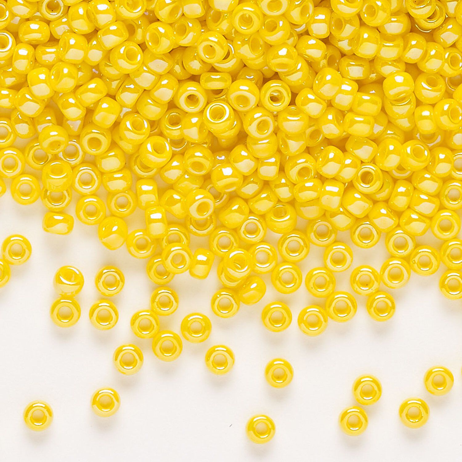 Seed bead, Miyuki, glass, pkg/250g, #8 rocaille, opaque rainbow canary (RR-472D).
