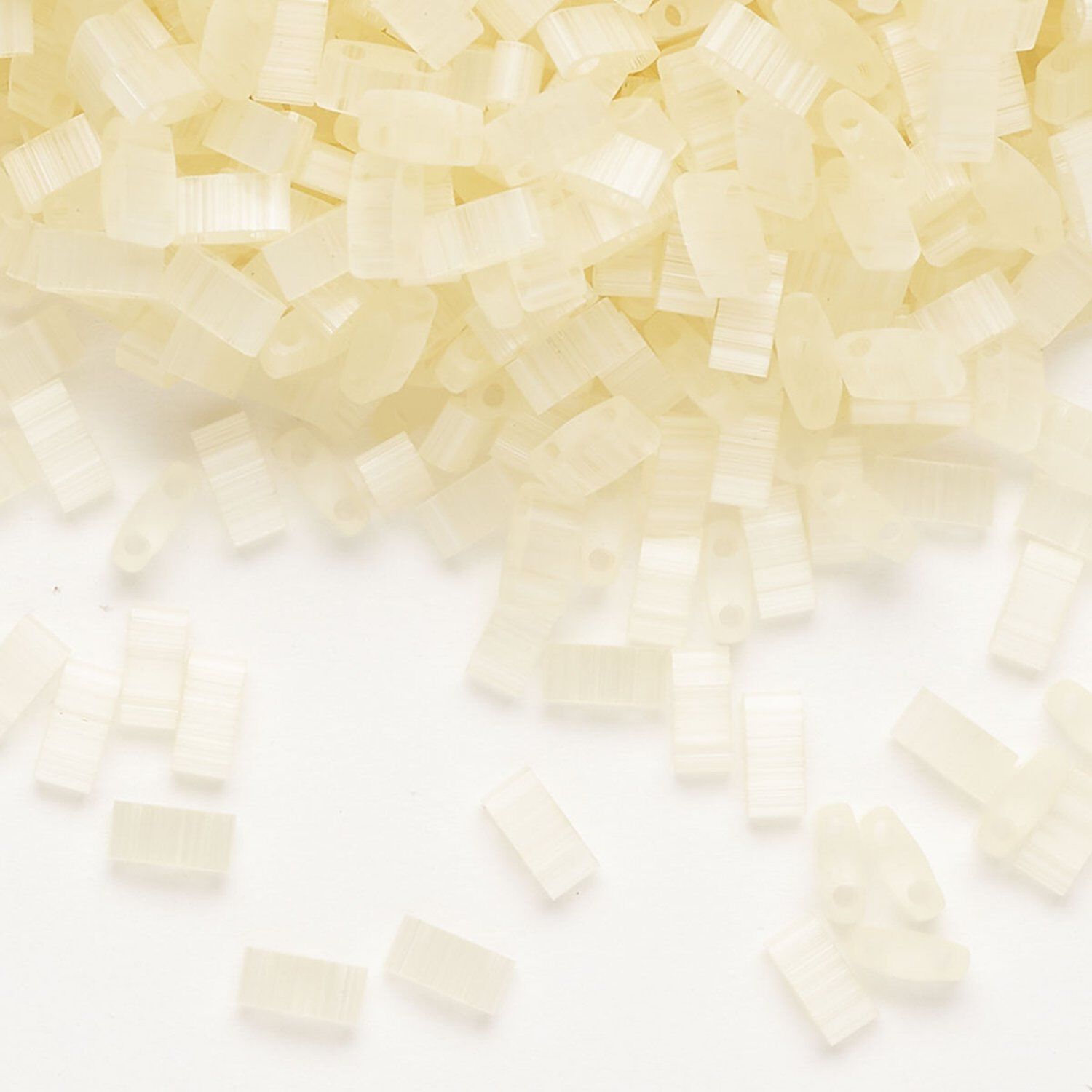 Seed bead, TILA®, glass, pkg/40g, 5x2.3mm half tila rectangle, translucent silk luster light yellow (HTL-2554-1).