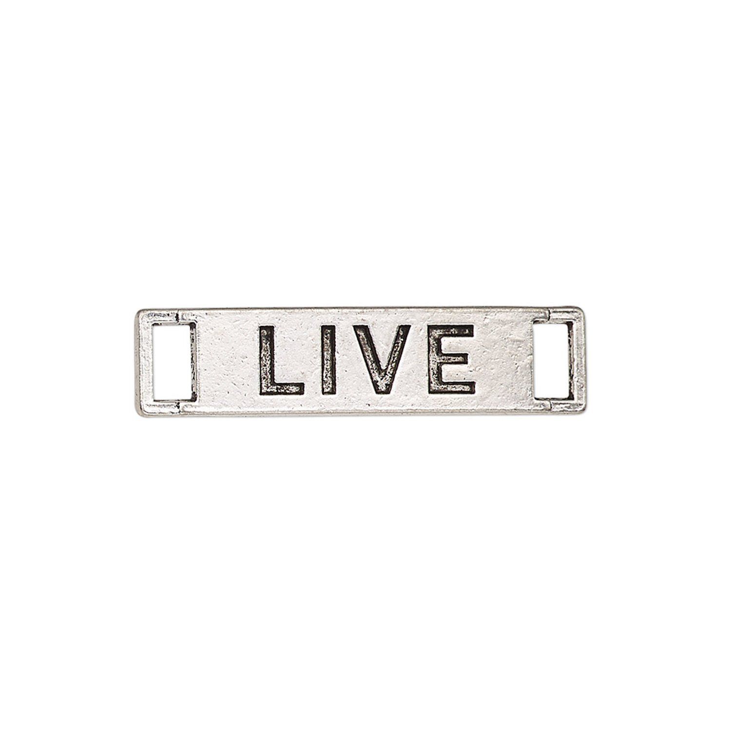 Link, antique silver-finished "pewter" (zinc-based alloy), 27.5x6.5mm single-sided curved flat rectangle with "LIVE." Sold per pkg of 2.