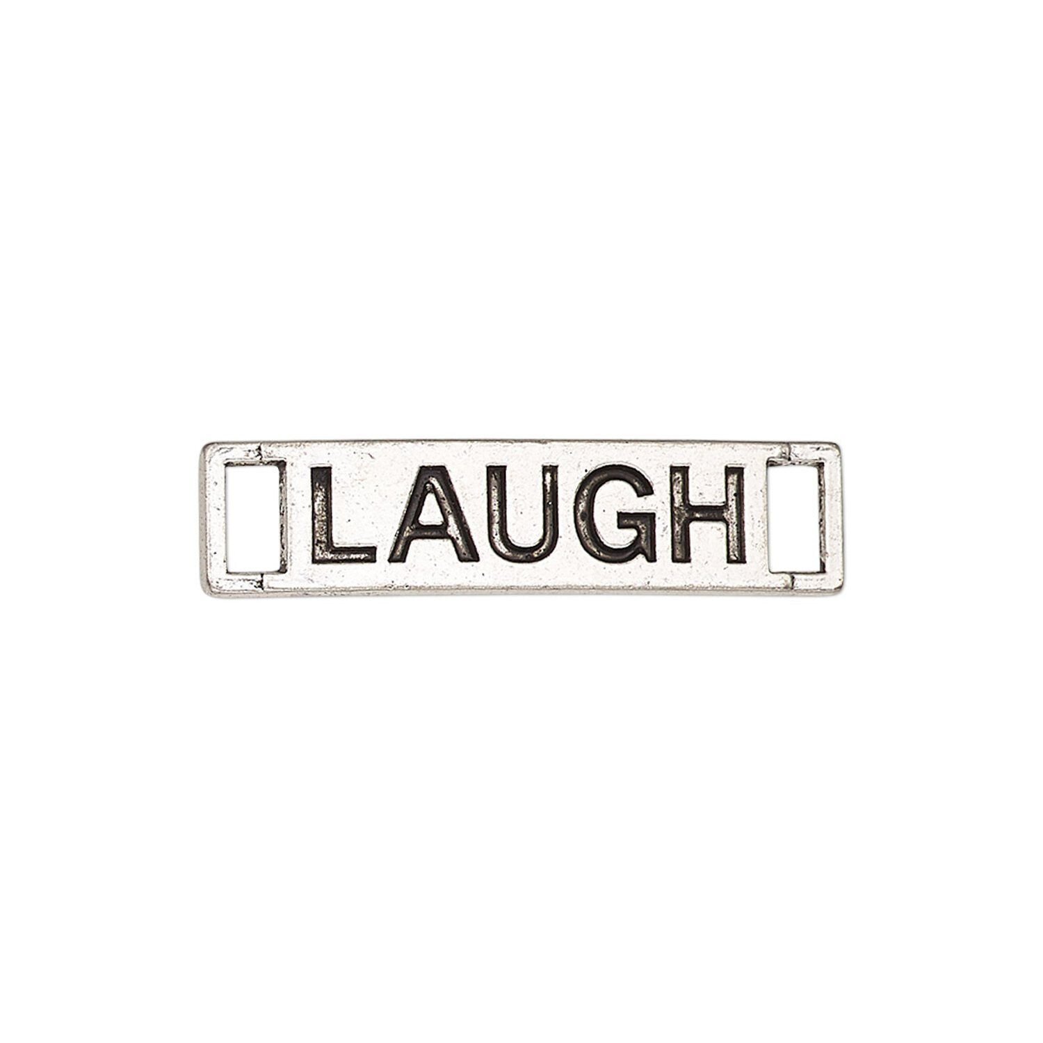 Link, antique silver-finished "pewter" (zinc-based alloy), 27.5x6.5mm single-sided curved flat rectangle with "LAUGH." Sold per pkg of 2.