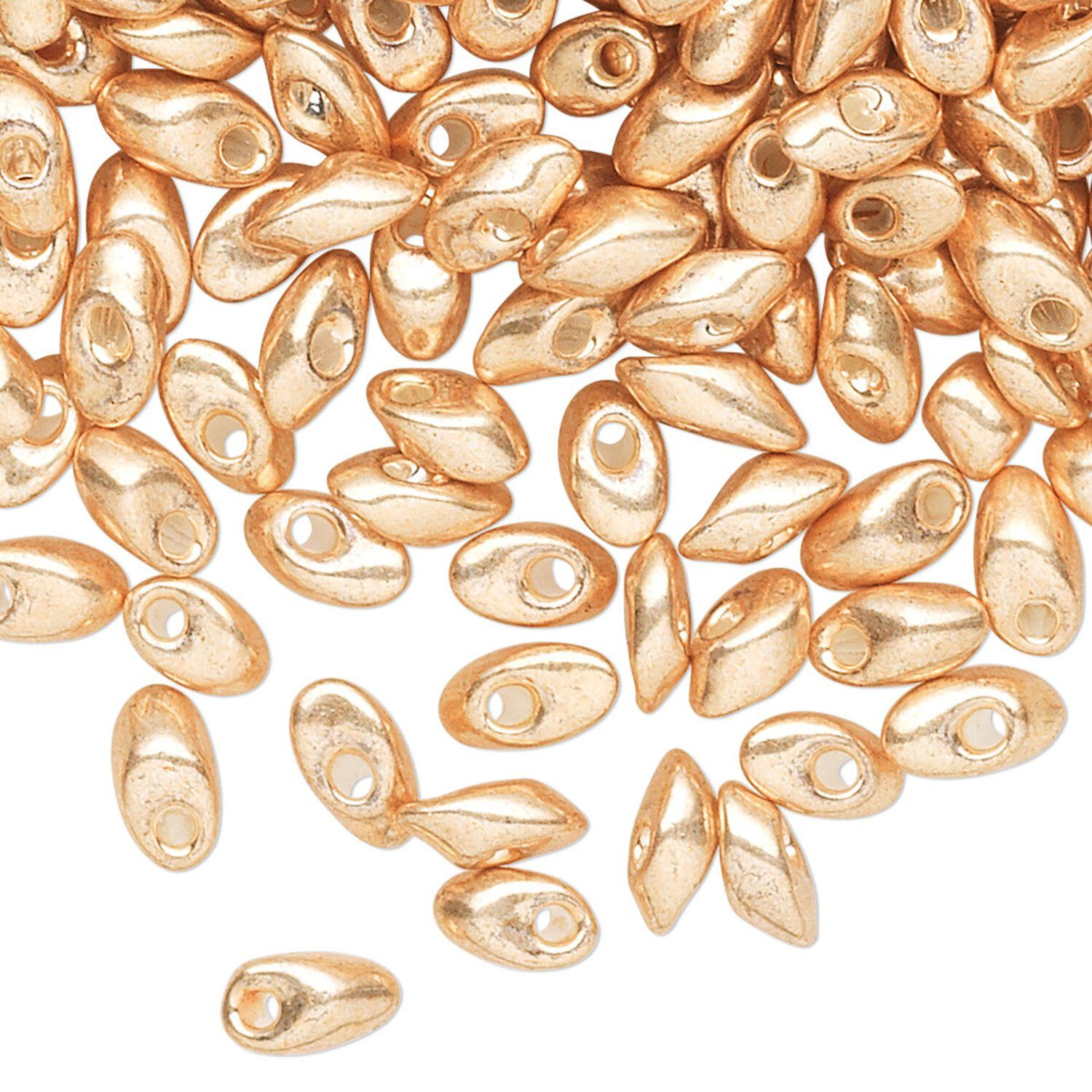 Seed bead, Miyuki, glass, pkg/10g, 7x4mm long magatama, opaque metallic shiny gold (LMA-1052).