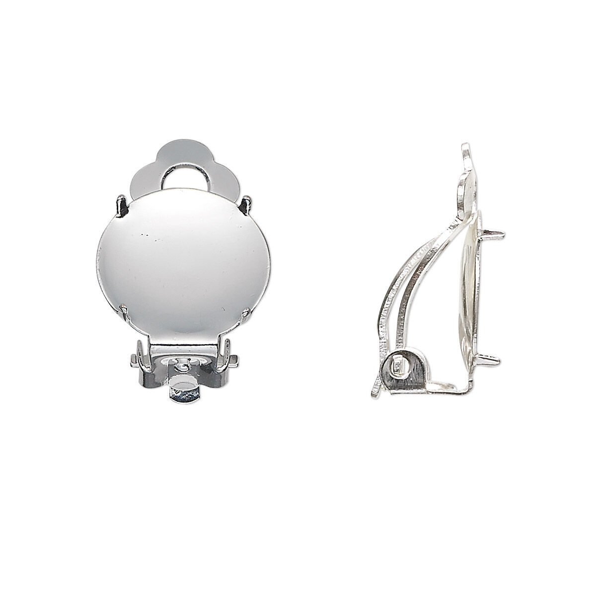 Earring clip-on 1pkg10 silver-plated, 14mm flat pad round / 13mm round 4-prong setting, steel / brass 5 pair