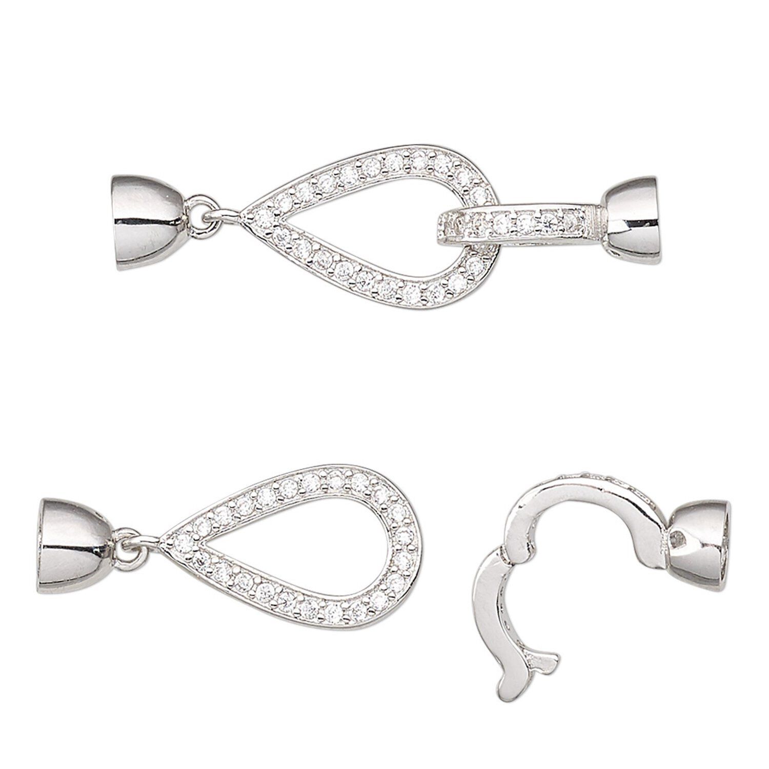 Clasp, single latch fold-over, cubic zirconia and rhodium-plated brass, clear, 31x9.5mm teardrop with glue-in ends, 3.5mm inside diameter. Sold individually.
