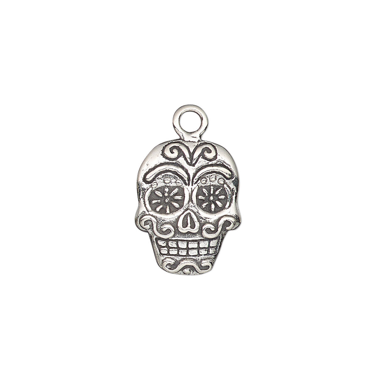 Charm, antiqued sterling silver, 15.5x12.5mm single-sided Dia de los Muertos skull with flower pattern. Sold individually.