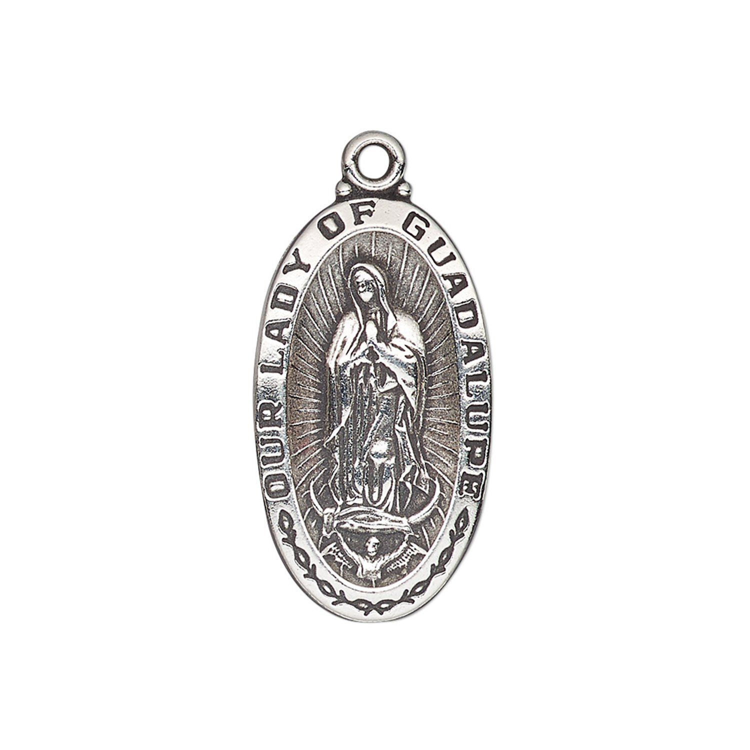 Drop, antiqued sterling silver, 26x14mm single-sided oval with "OUR LADY OF GUADALUPE." Sold individually.