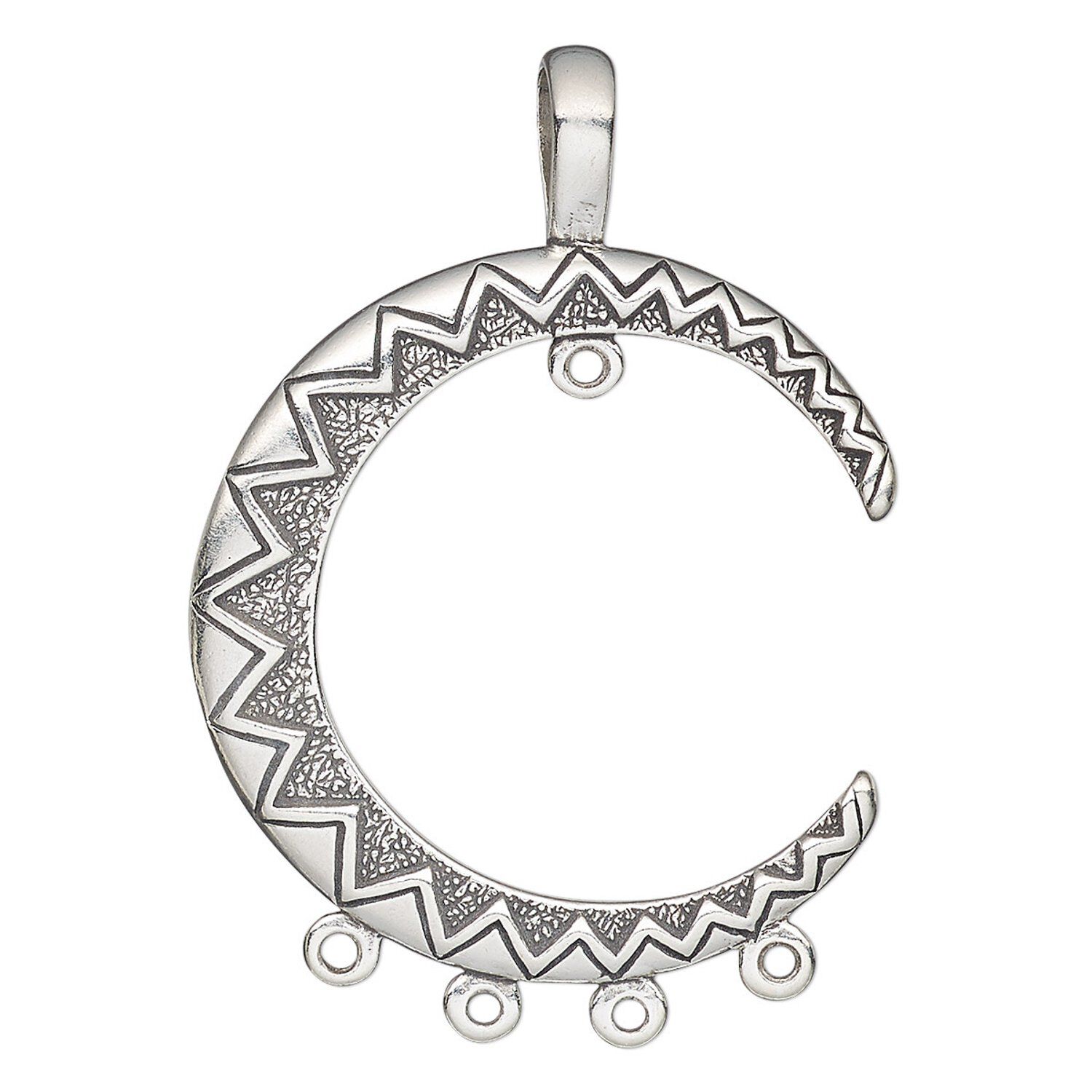 Charm, antiqued sterling silver, 43x32mm single-sided moon with zigzag design and 5 loops. Sold individually.