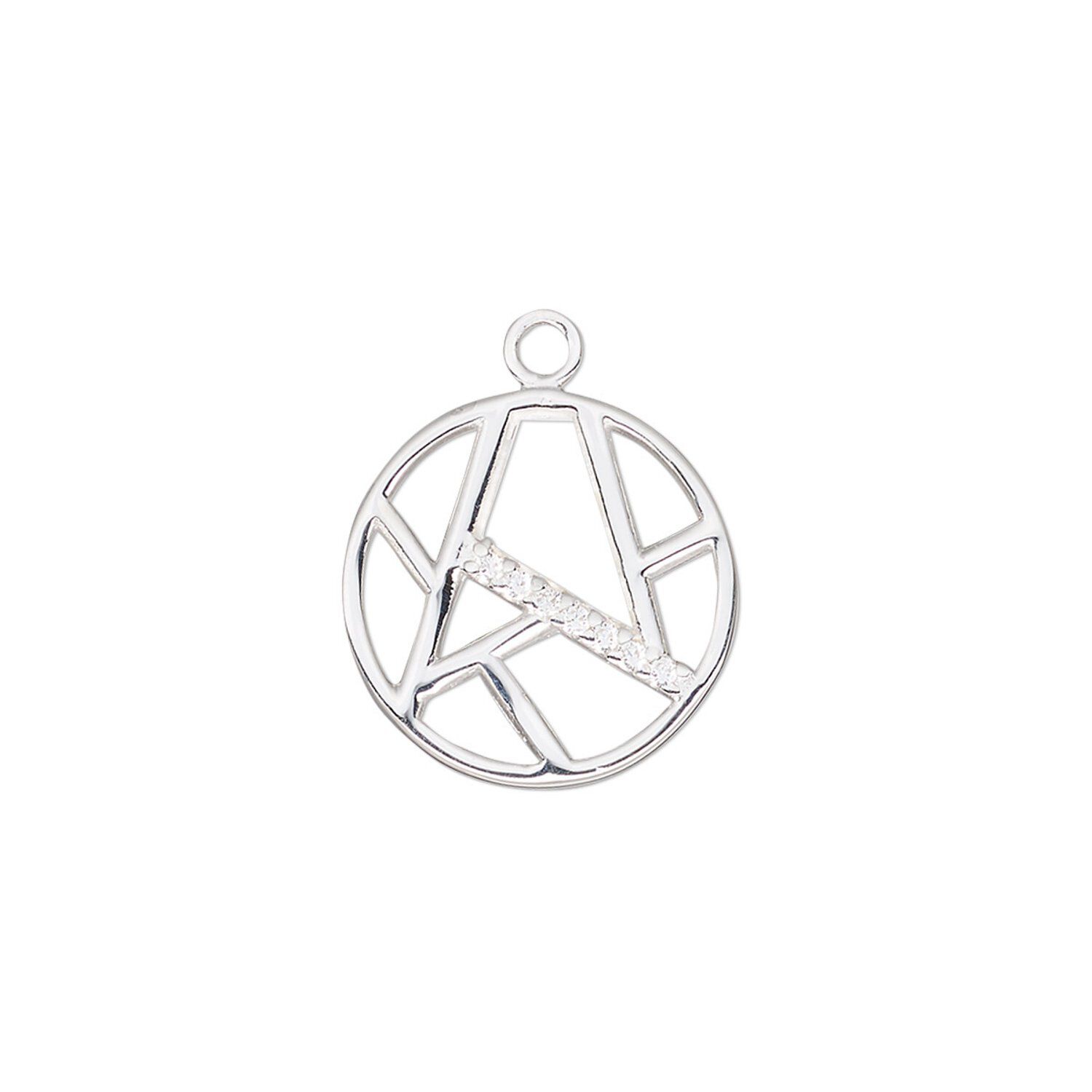 Drop, sterling silver and cubic zirconia, clear, 16mm single-sided round with cutout geometric pattern. Sold individually.