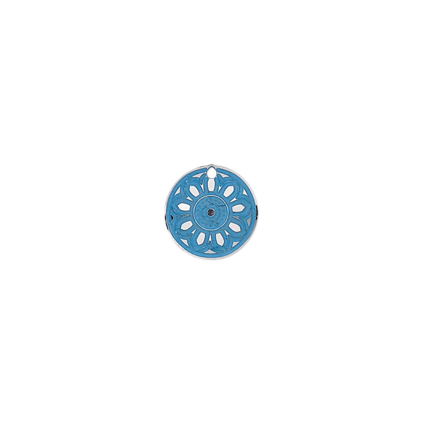 Drop, stainless steel, blue patina, 10mm single-sided domed round with flower mandala design. Sold per pkg of 8.