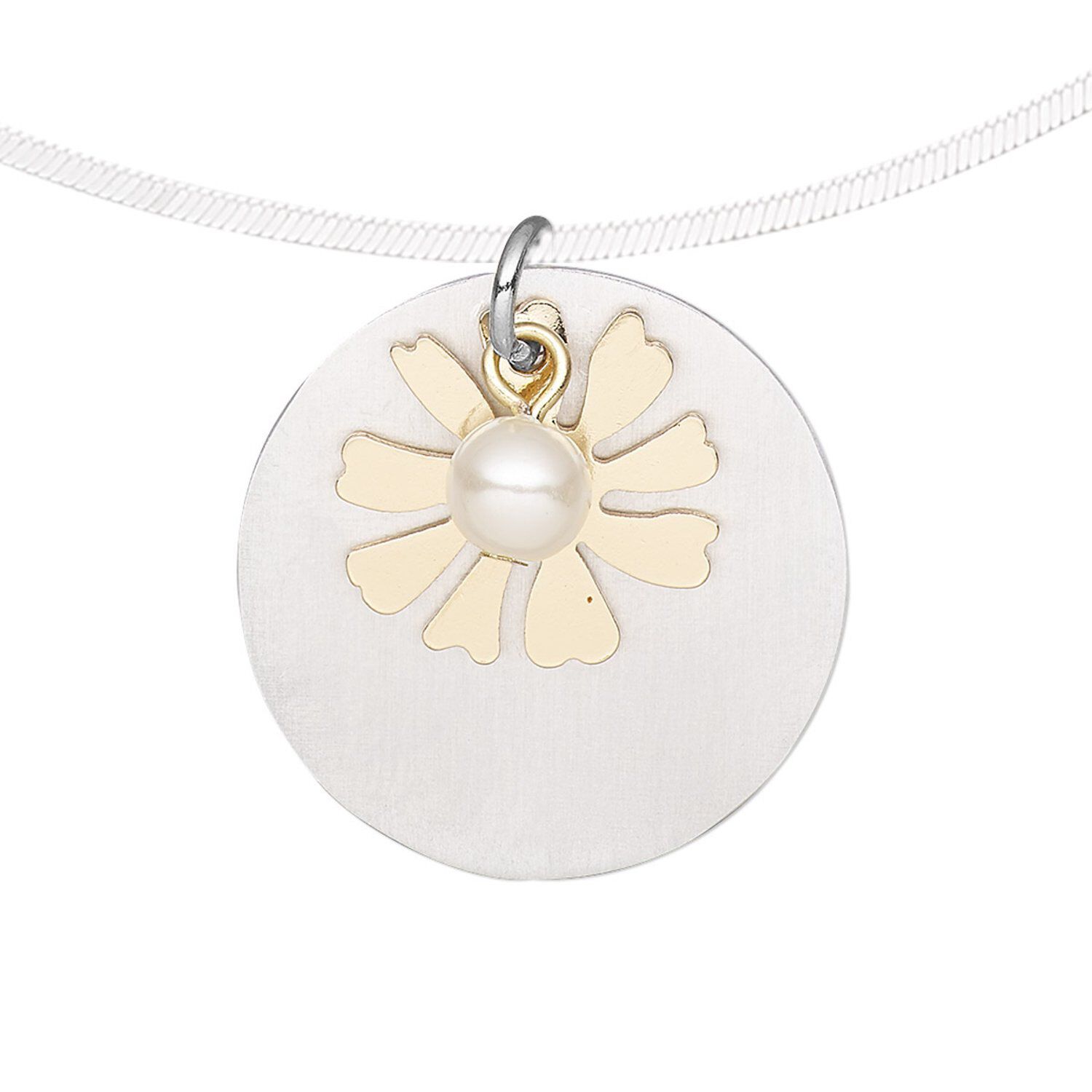 Drop, gold-finished "pewter" (zinc-based alloy) and aluminum, white, 25mm single-sided brushed flat round /16x15mm flat flower / 6mm acrylic pearl with steel jump ring. Sold per pkg of 2.