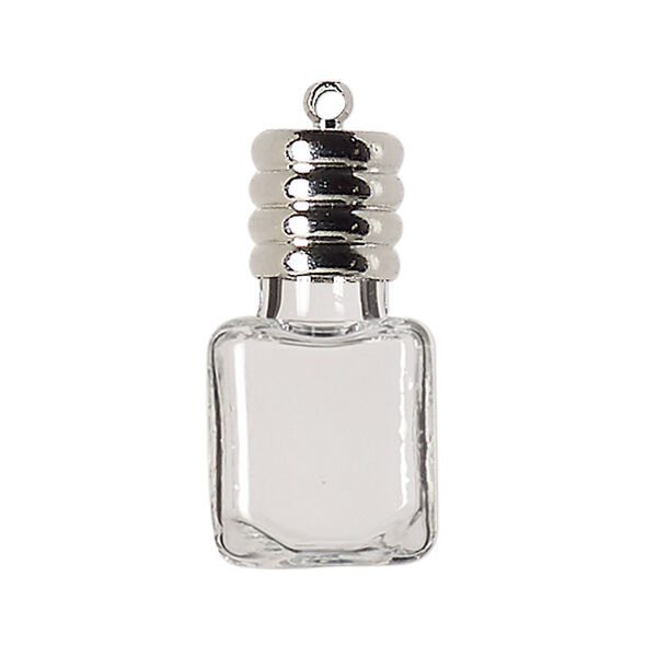 Drop, lampworked glass and silver-finished brass, clear, 26x14mm-28x15mm square bottle with cap, 5.5mm hole. Sold individually.