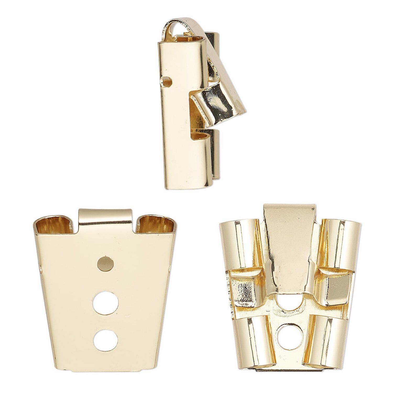 Gold-finished brass bola slide uses customer-requested squeeze action--as opposed to lever action to hold bola cord securely. Works with wide cord or multiple smaller cords together. First glue a cabochon or ornament to the front face of the bola slide. To attach the cord, squeeze the tension tab, slide the cord through, then release. Using pliers, attach the bola cord tips by evenly crimping the tabs at the wide part of the tip against the cord. Adjusting the bola tie is simple, just press and hold the button to loosen or tighten the tie by sliding the cord.