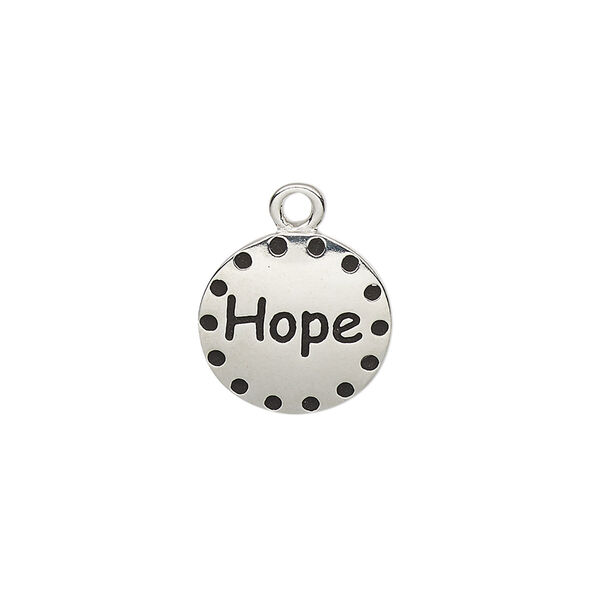 Drop, enamel and imitation rhodium-plated "pewter" (zinc-based alloy), black, 14.5mm single-sided round with "Hope." Sold individually.
