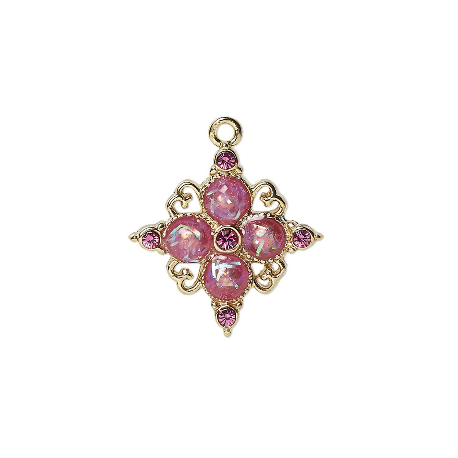Drop, cubic zirconia / acrylic / gold-finished "pewter" (zinc-based alloy), pink opalescent, 19mm single-sided diamond. Sold individually.