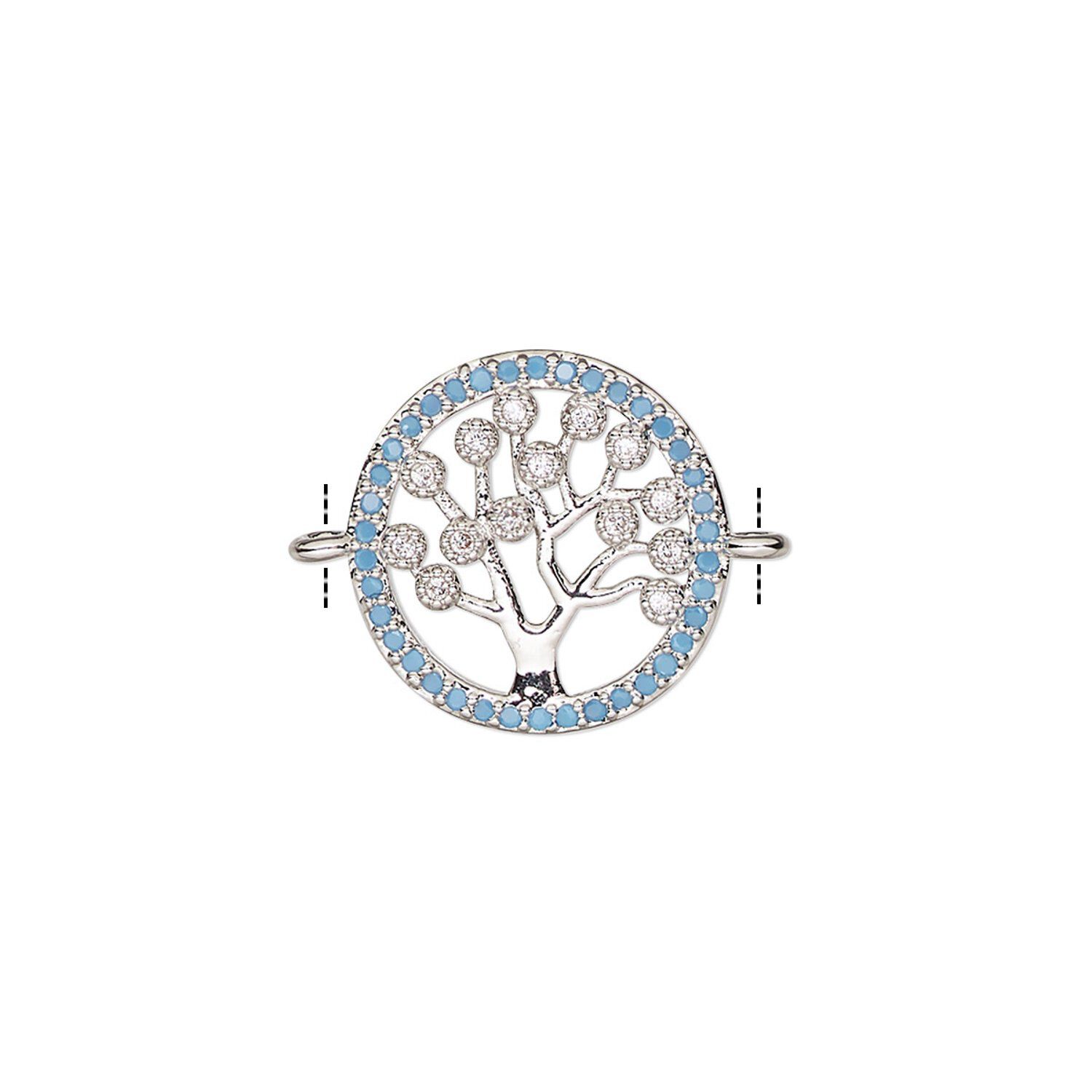 Link, cubic zirconia and silver-finished brass, clear and blue, 15mm single-sided round with tree of life design. Sold individually.