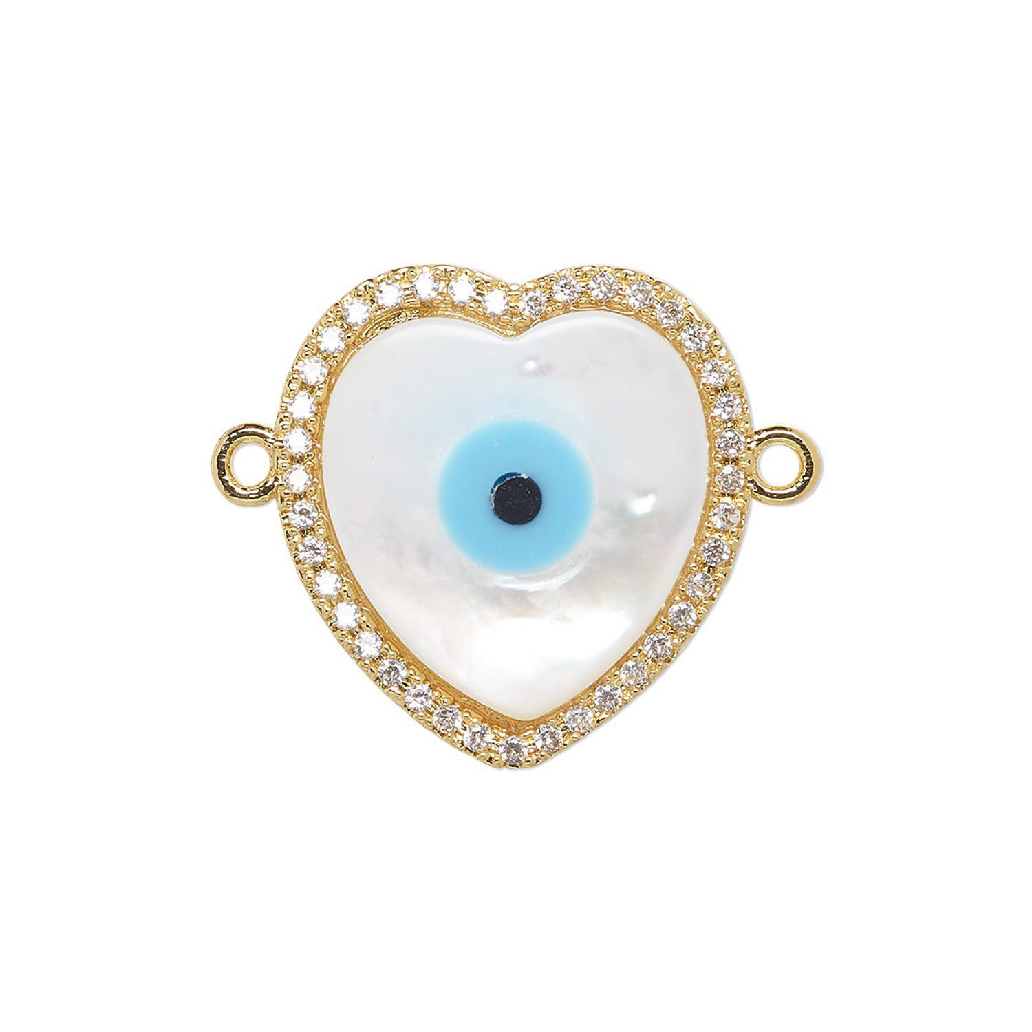 Link, gold-finished brass / mother-of-pearl shell / cubic zirconia / resin, multicolored, 18x17mm single-sided heart with eye design. Sold individually.