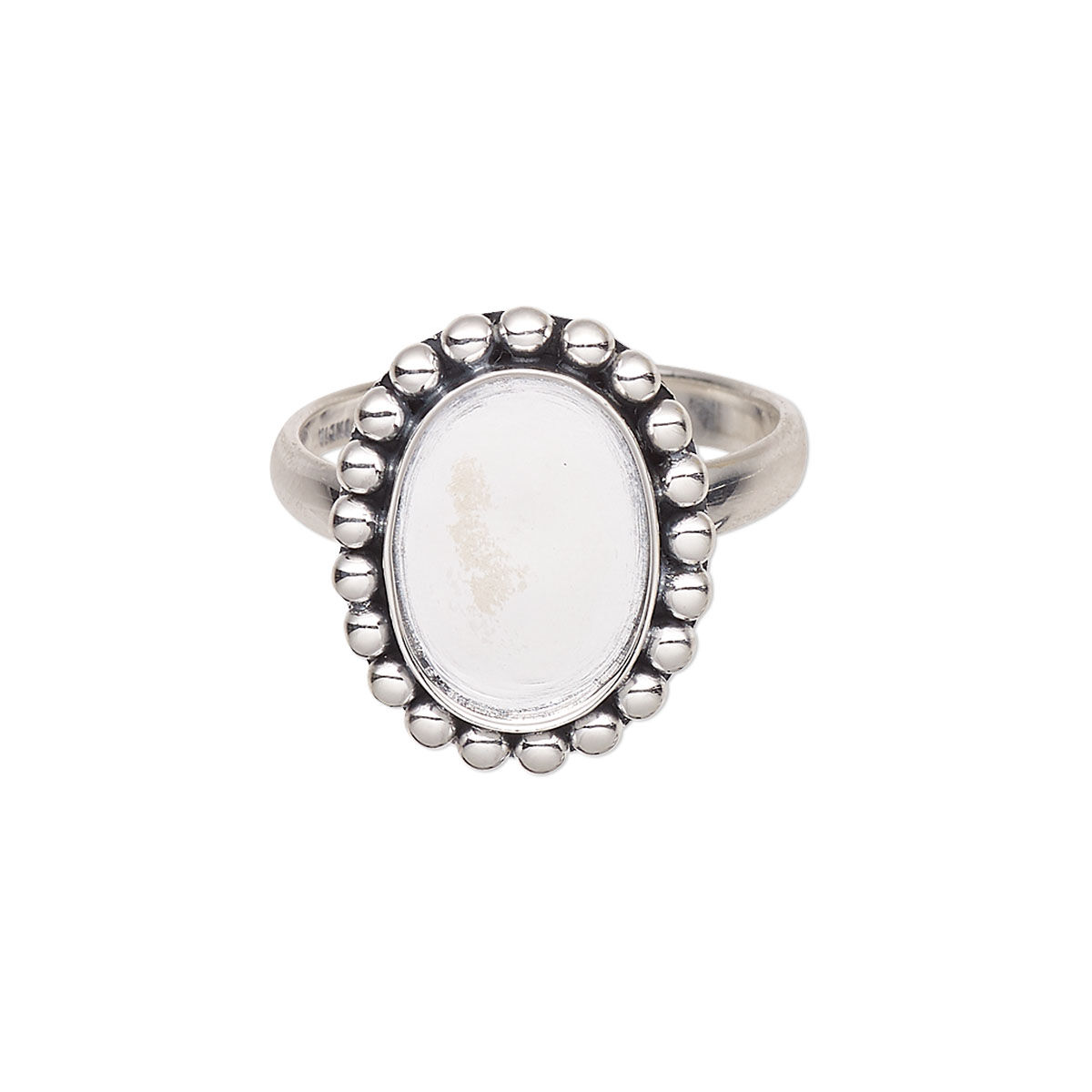 This handcrafted ring with a beaded rim is rendered in beautiful antique sterling silver, a favorite metal in jewelry for its elegant look and timeless precious-metal appeal. The oval setting accommodates 14x10mm oval cabochons for a wide variety of looks to suit your design needs. Sizes, shapes and colors may vary with handcrafted items.