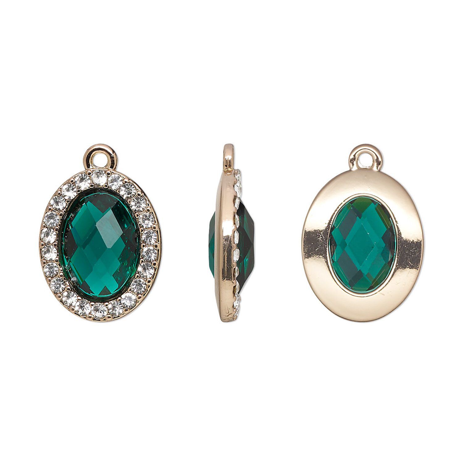 Drop, glass / glass rhinestone / gold-finished "pewter" (zinc-based alloy), clear and transparent emerald green, 19x15.5mm single-sided oval. Sold per pkg of 2.