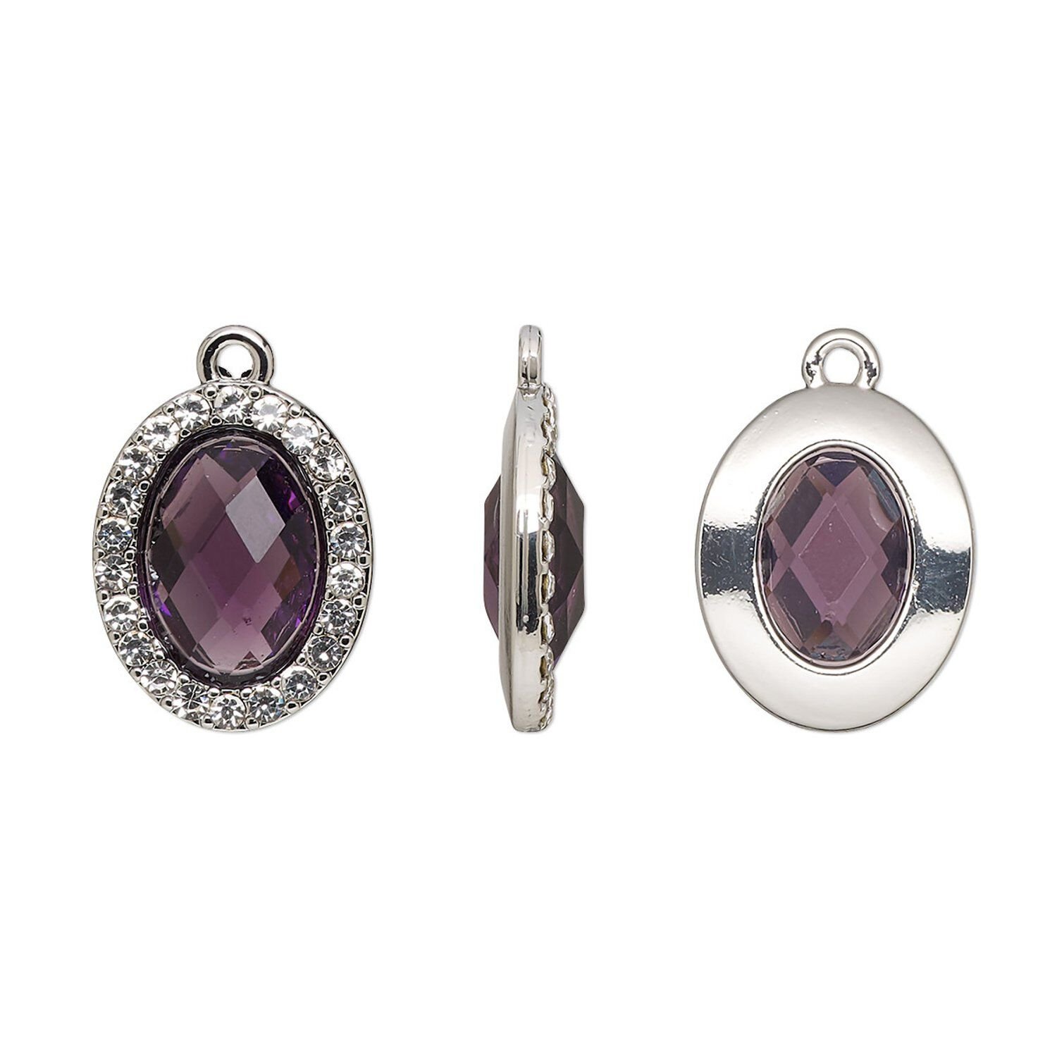 Drop, glass / glass rhinestone / imitation rhodium-finished "pewter" (zinc-based alloy), clear and transparent amethyst purple, 19x15.5mm single-sided oval. Sold per pkg of 2.