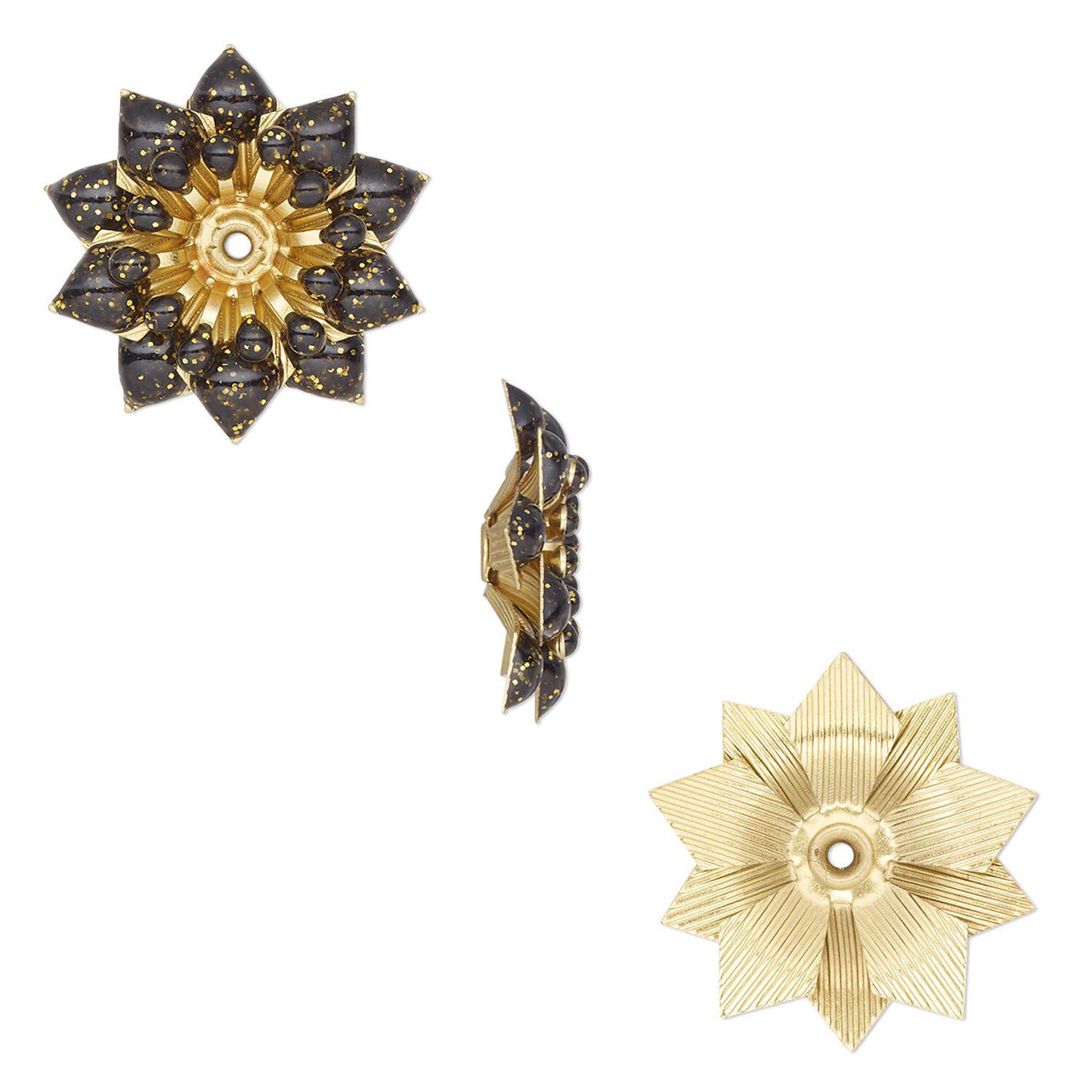 Gold-finished copper components in eye-catching flower pattern design feature black with gold glitter epoxy "petals." The flower can be strung onto a head pin along with beads and other components as well as sewn onto leather and other materials.