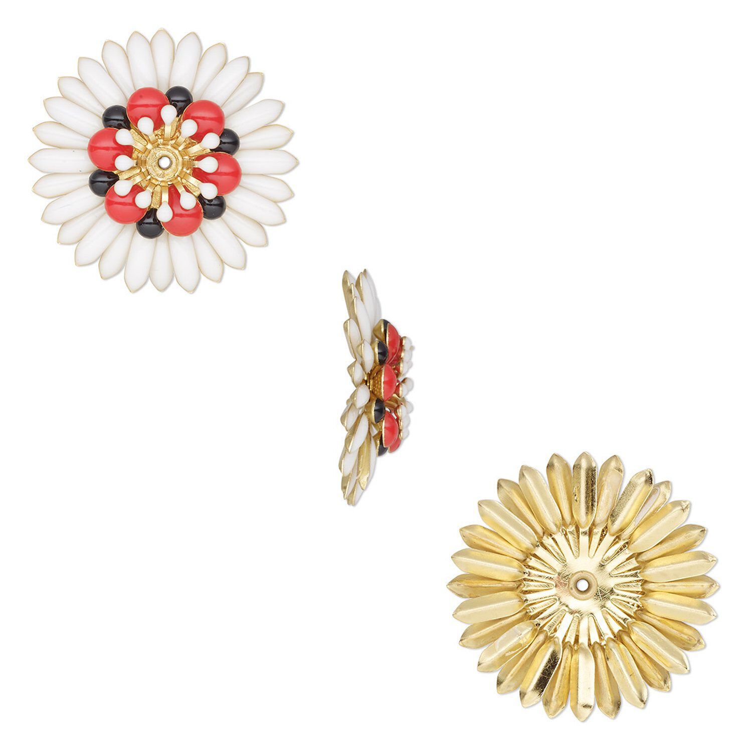 Gold-finished copper components in eye-catching flower pattern design feature white, red and black epoxy "petals." The flower can be strung onto a head pin along with beads and other components as well as sewn onto leather and other materials.