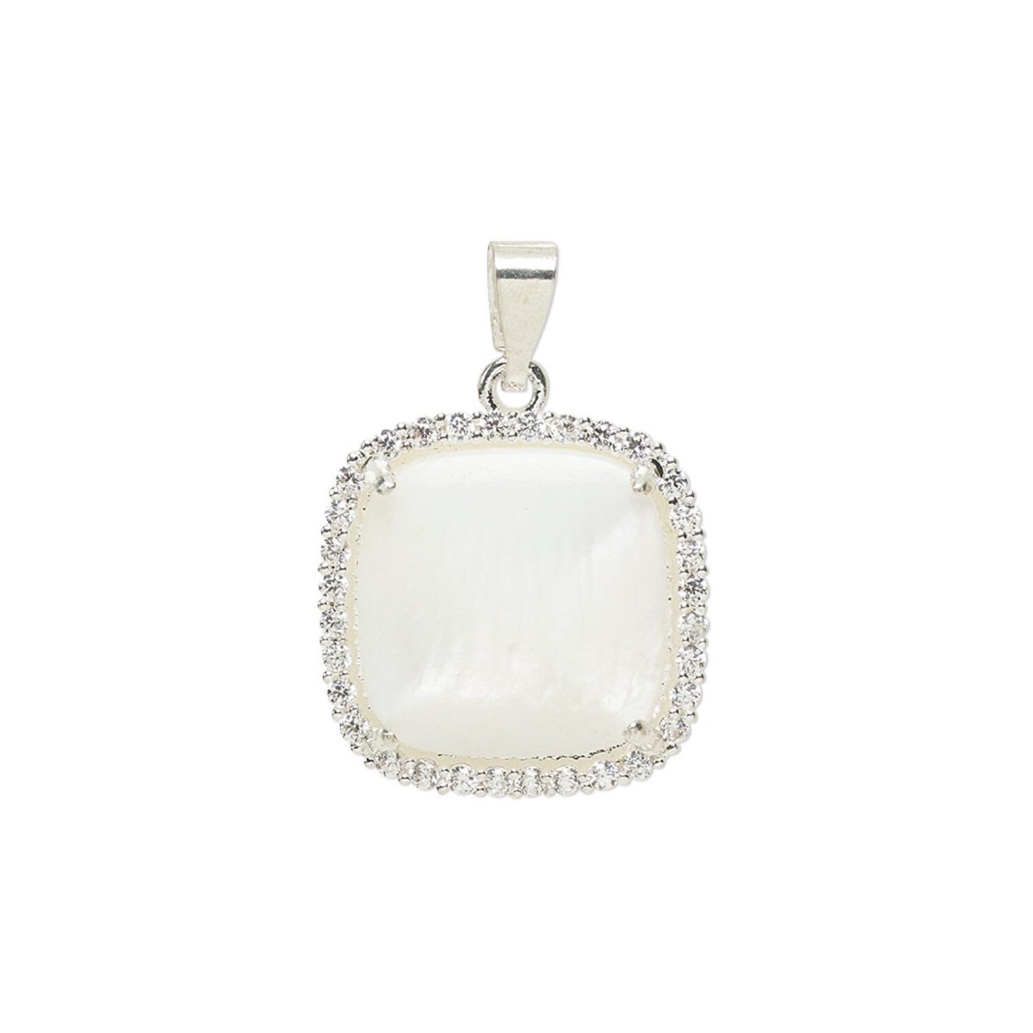 Pendant, glass rhinestone / mother-of-pearl shell / silver-finished brass, clear and white, 17mm single-sided square. Sold individually.