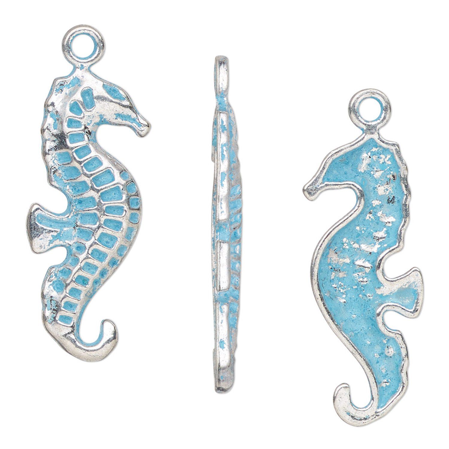 Seahorse charms are great for nautical-themed jewelry. The blue patina over silver suggests weathering and aging like ancient artifacts found on a Mediterranean beach. Since the patina finish can wear over time, it is recommended to use a fixative to secure and deepen the color. Machine-made for consistent size and shape, they're great for designs requiring a uniform look.