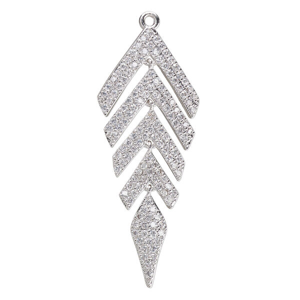 Focal, cubic zirconia and silver-plated brass, clear, 51.5x19.5mm single-sided feather. Sold individually.
