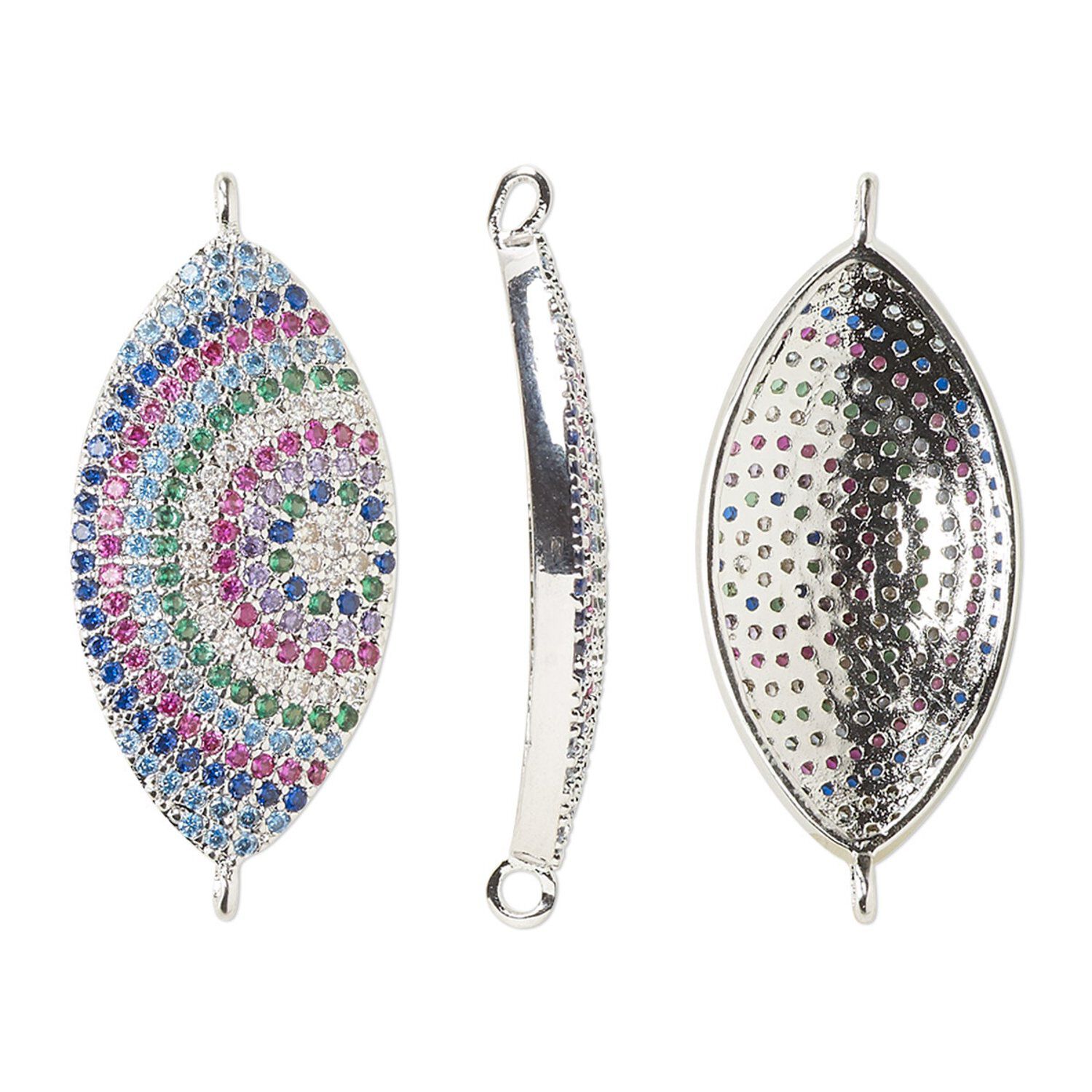 Link, cubic zirconia and silver-finished brass, multicolored, 25x13.5mm single-sided domed marquise with circle design. Sold individually.