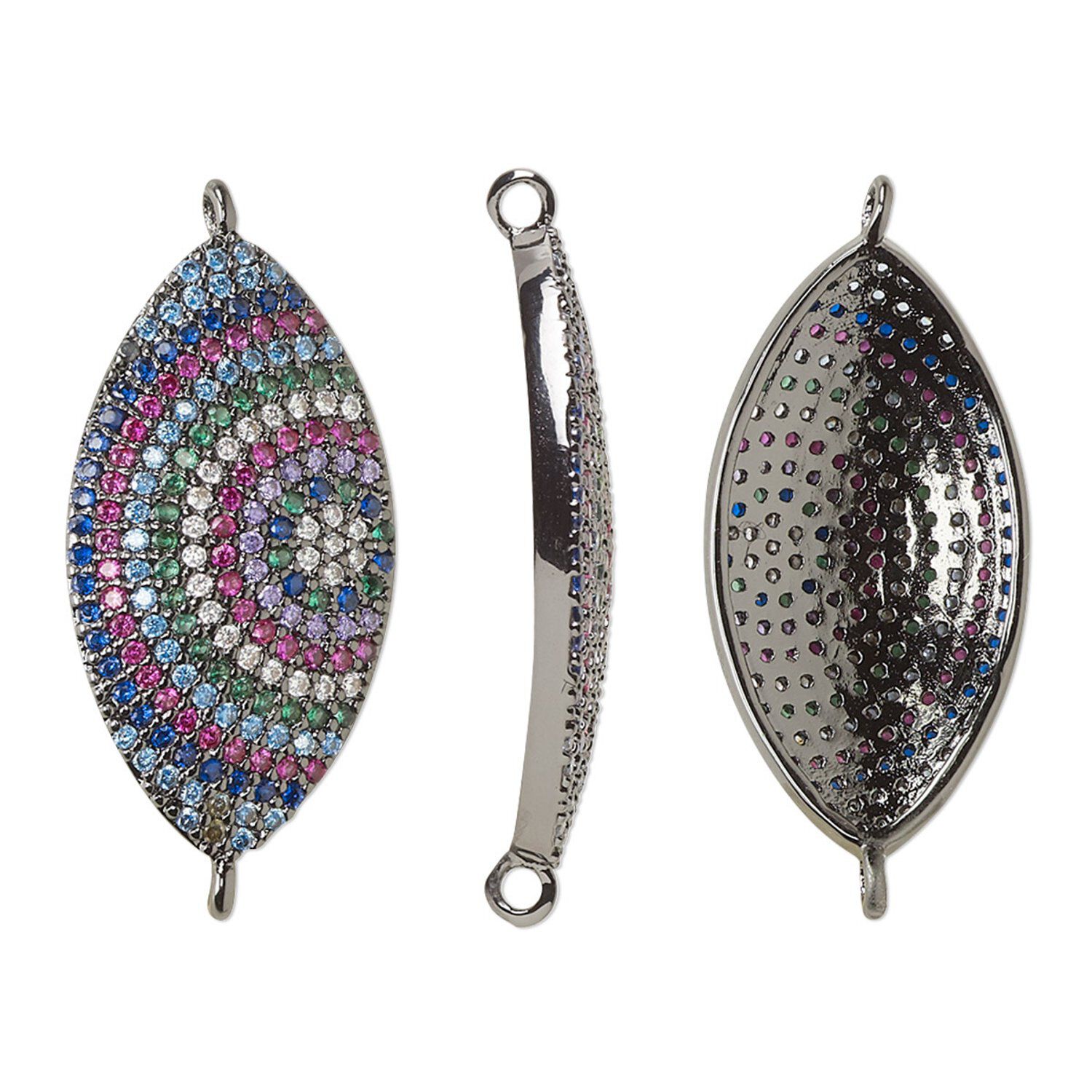 Link, cubic zirconia and black-finished brass, multicolored, 25x13.5mm single-sided domed marquise with circle design. Sold individually.